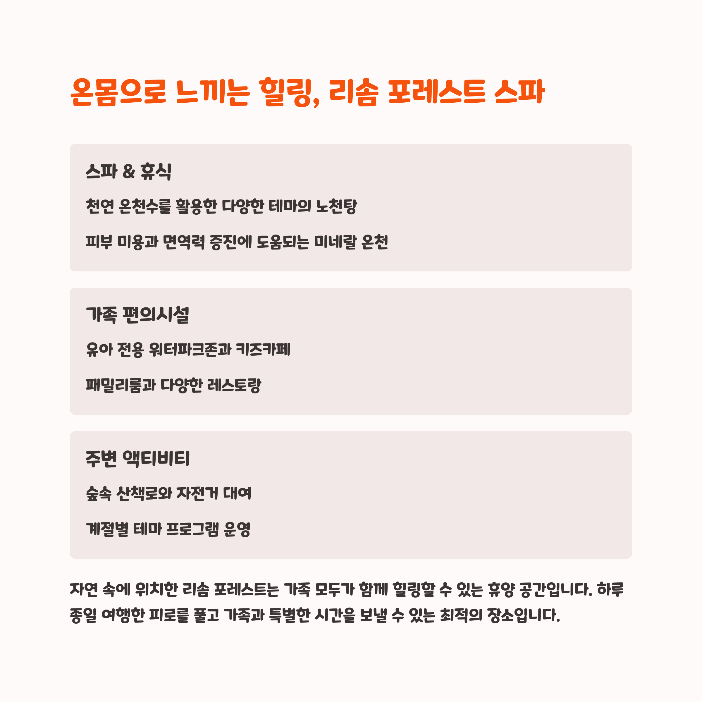 맑은 숲 속에서 즐기는 온천은 가족 모두에게 최고의 힐링이었습니다