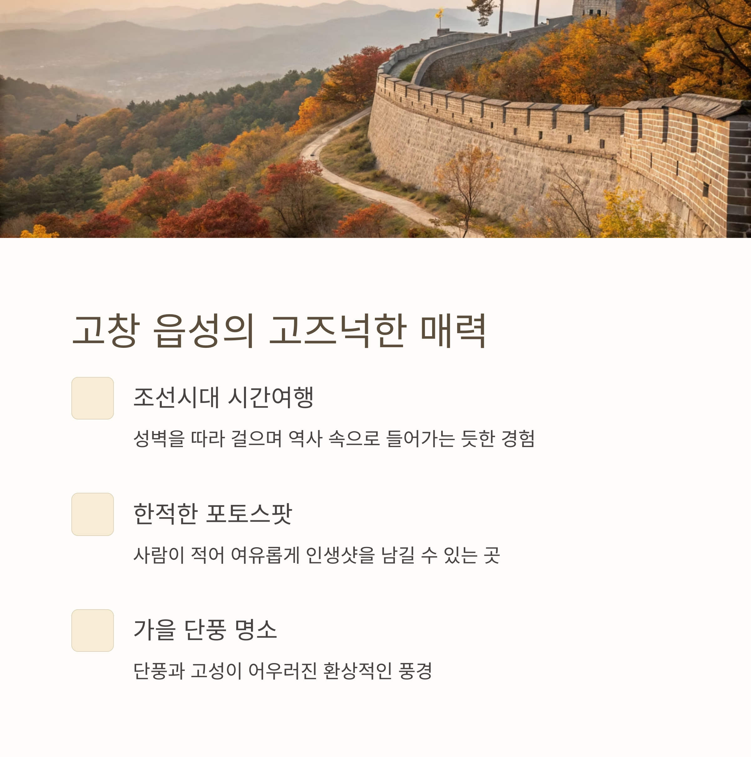 특히 가을에 가면 단풍과 고즈넉한 성벽이 어우러져 인생샷 명소랍니다.