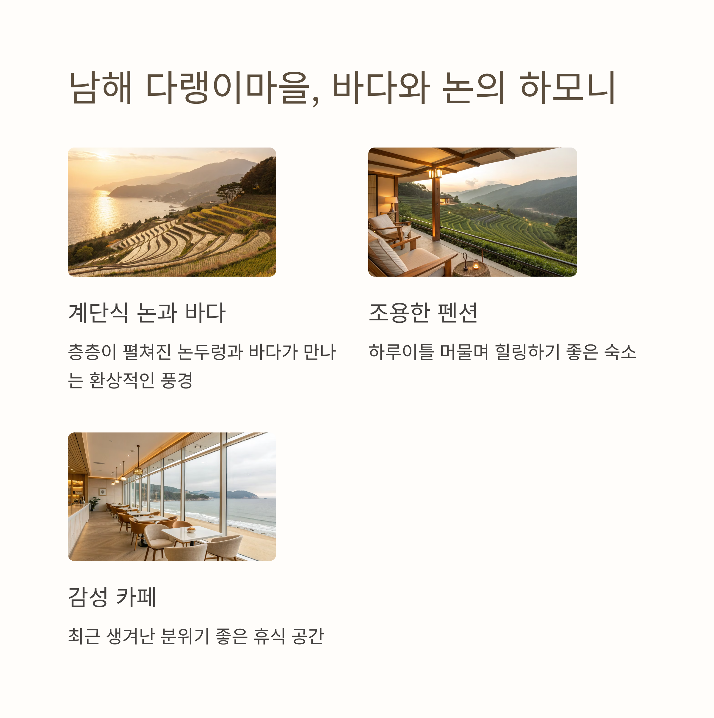 논두렁이 층층이 펼쳐진 모습은 정말 인상적이고, 계단식 논과 바다가 어우러진 풍경이 환상적이에요.
