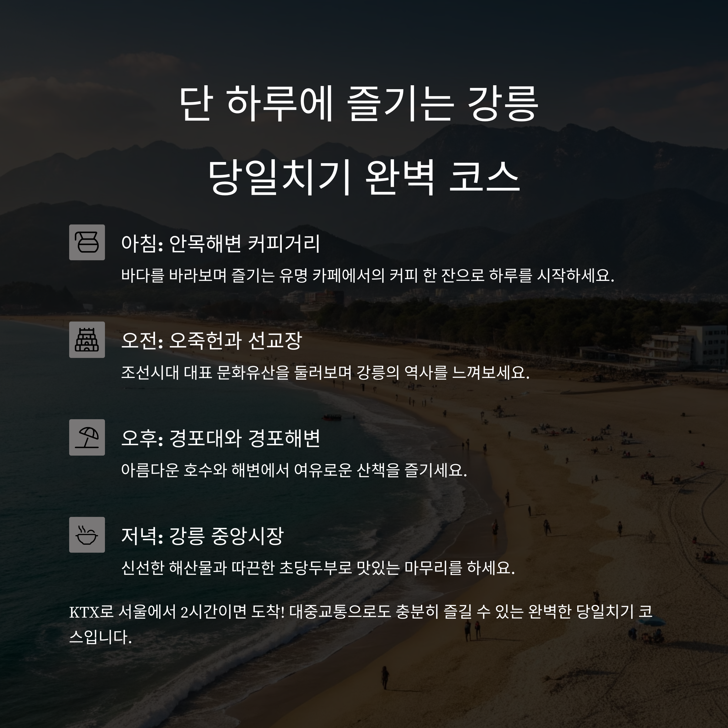 강릉의 바다, 역사, 먹거리를 하루 만에 즐기는 완벽한 당일치기 여행 코스! 효율적인 동선과 추천 맛집, 명소 정보를 한눈에 확인하세요.