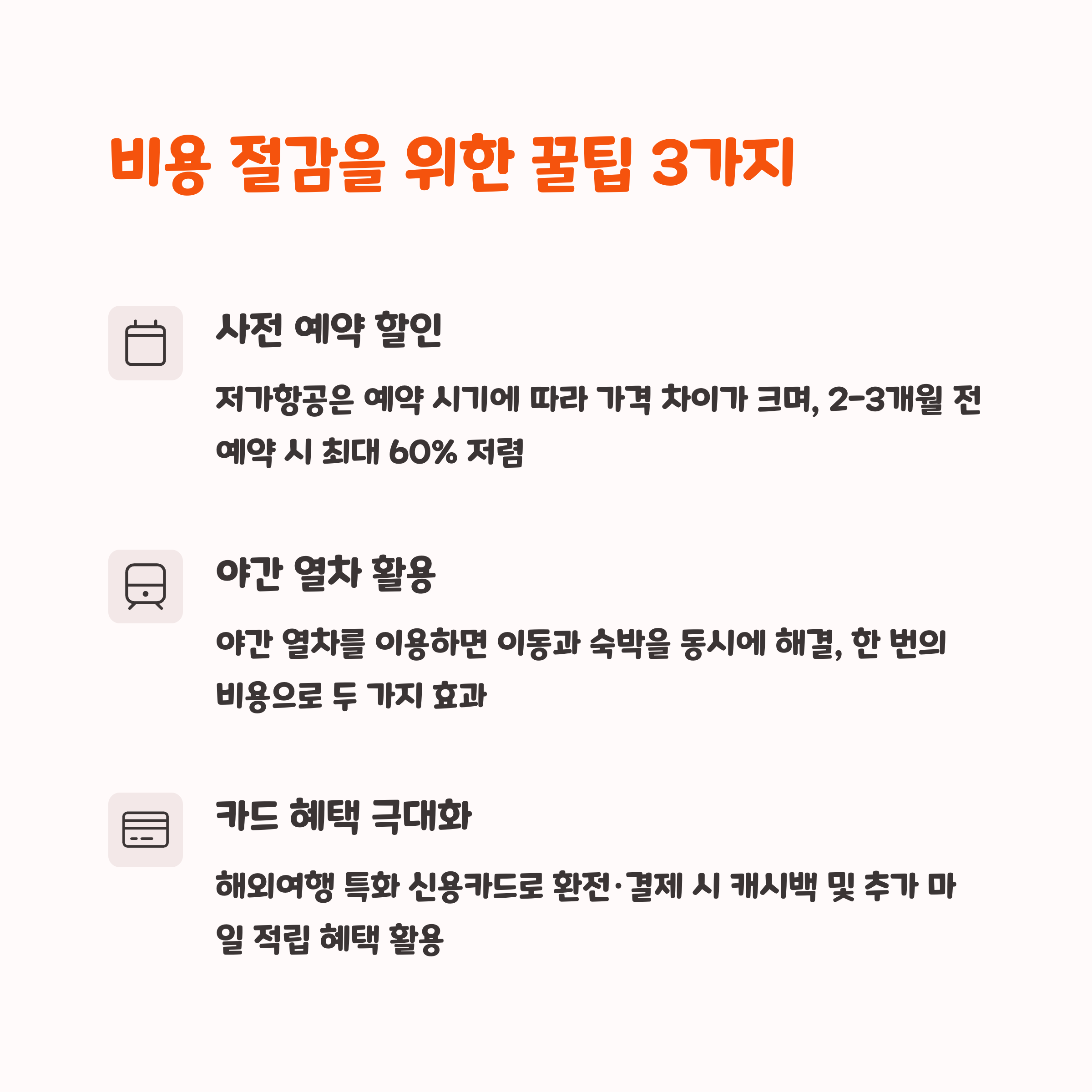 | 6개월~1년 전 예약 시 좌석 확보 유리 | 열차+저가항공 조합으로 실속 있는 이동 | 편도 마일 조합 활용으로 유연한 여정 설계 |