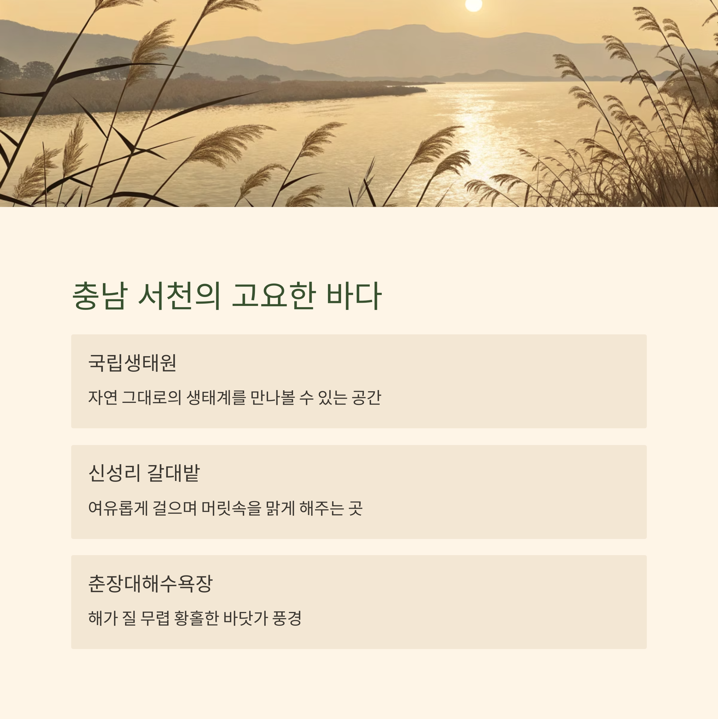 국립생태원, 신성리 갈대밭, 춘장대해수욕장 등 한적한 풍경이 매력적이에요.