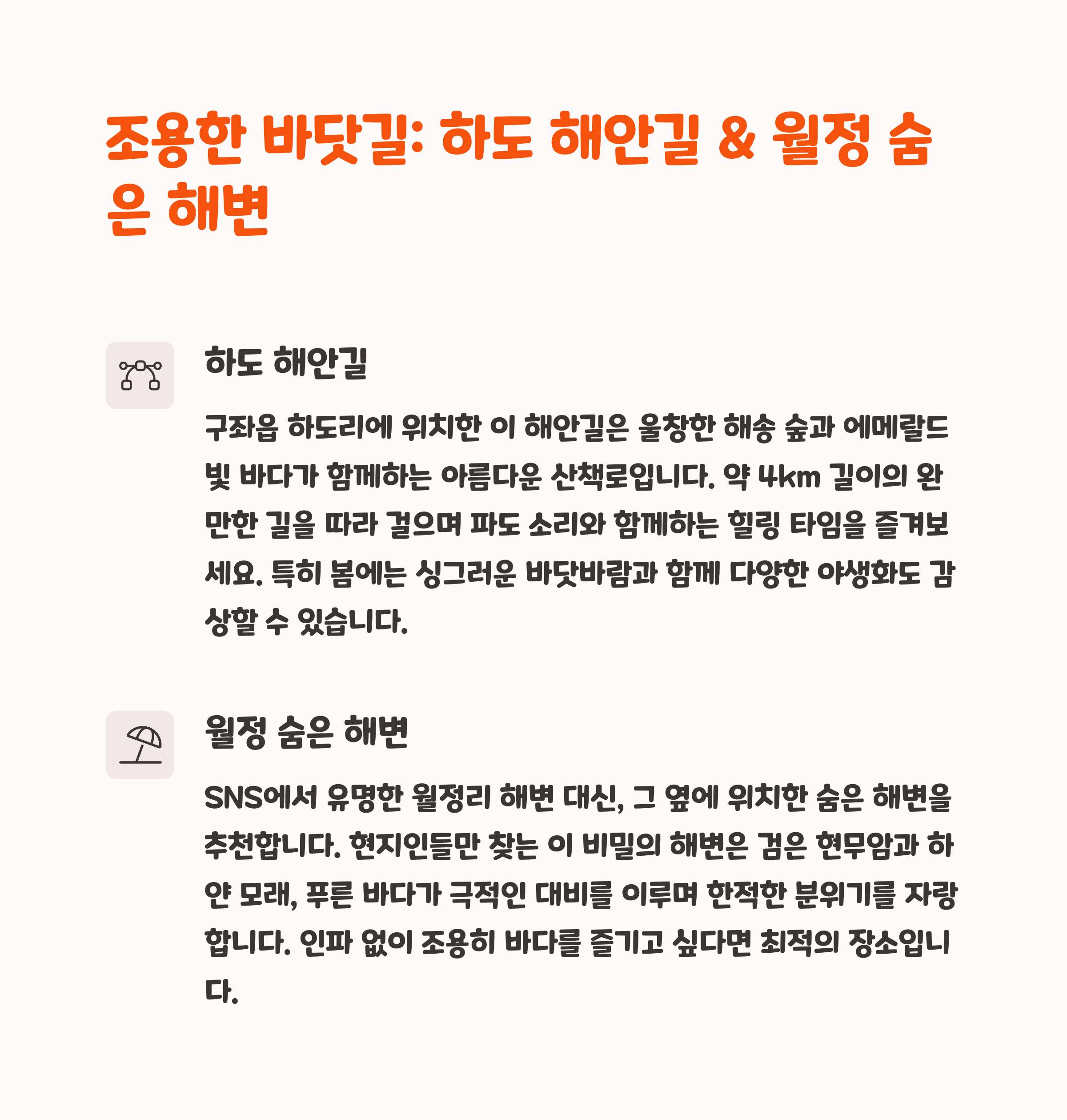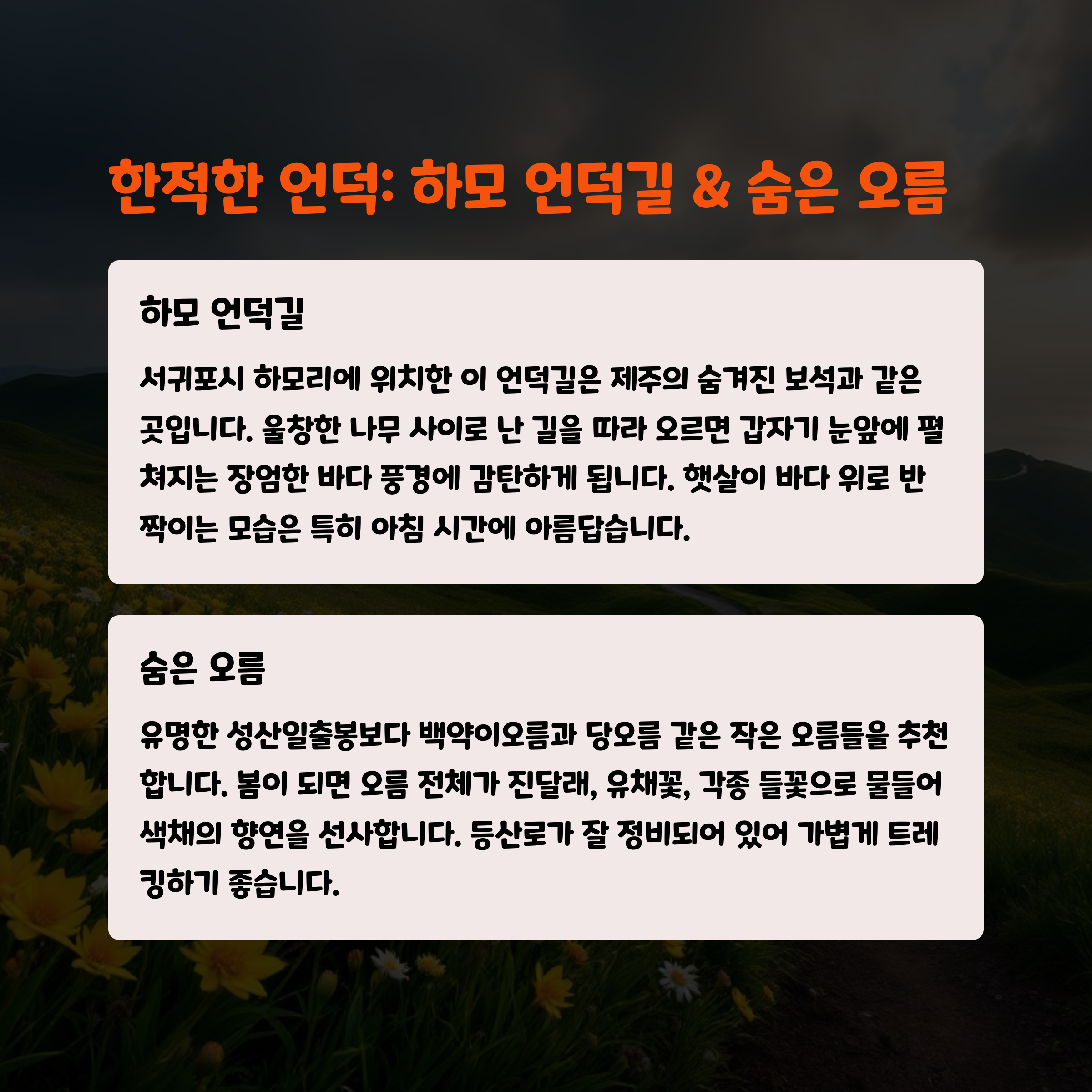 봄의 제주도는 그 자체로도 아름답지만, 사람이 적고 조용한 숨은 명소들을 찾는다면 진짜 힐링을 경험할 수 있습니다. 선흘, 하도, 오조리 같은 로컬 지역을 천천히 걸어보며 제주의 속살을 느껴보세요. 관광지보다 더 제주다운 장소에서 진짜 나만의 여행을 만들어 보세요. 지금 지도 앱에 저장해두는 걸 추천드립니다!