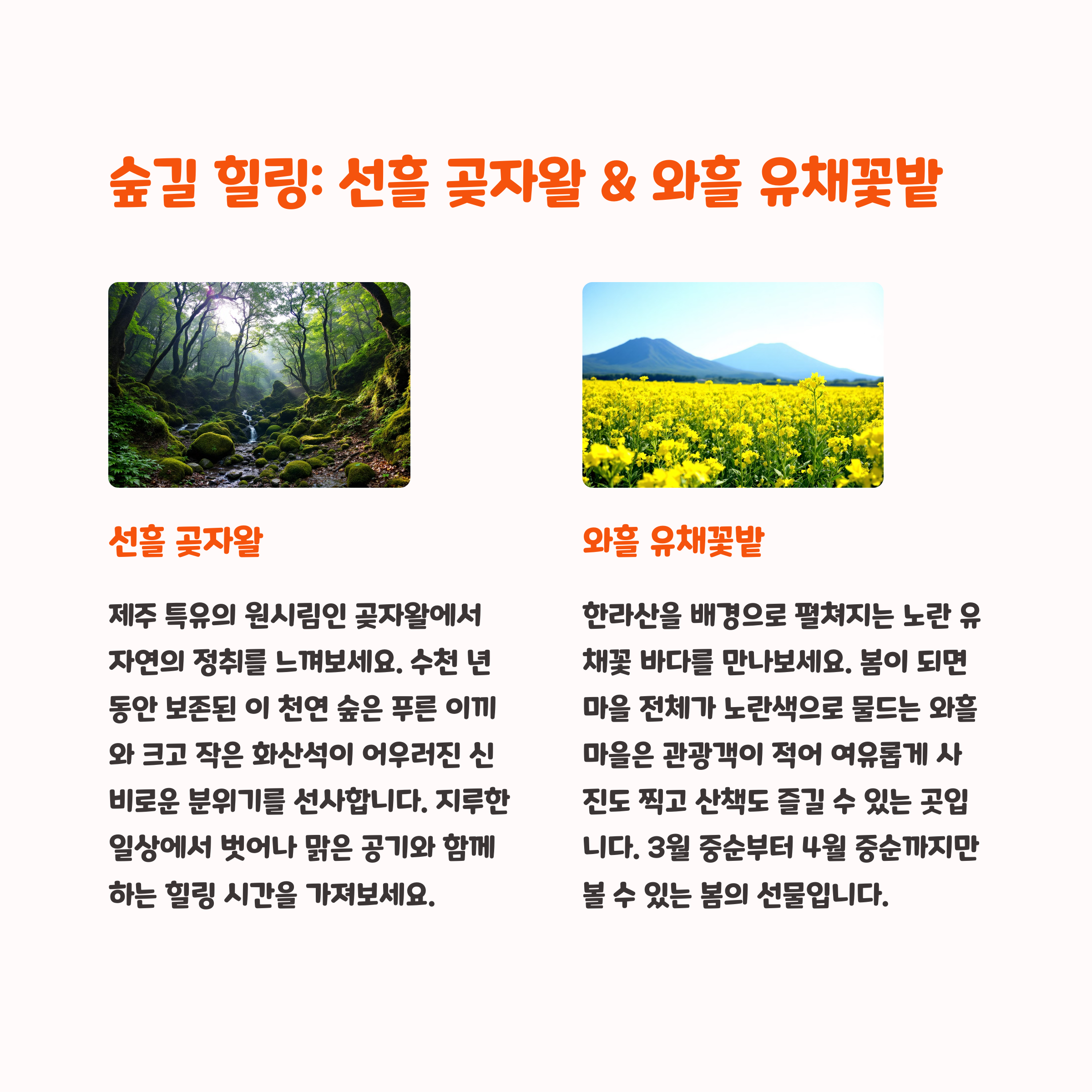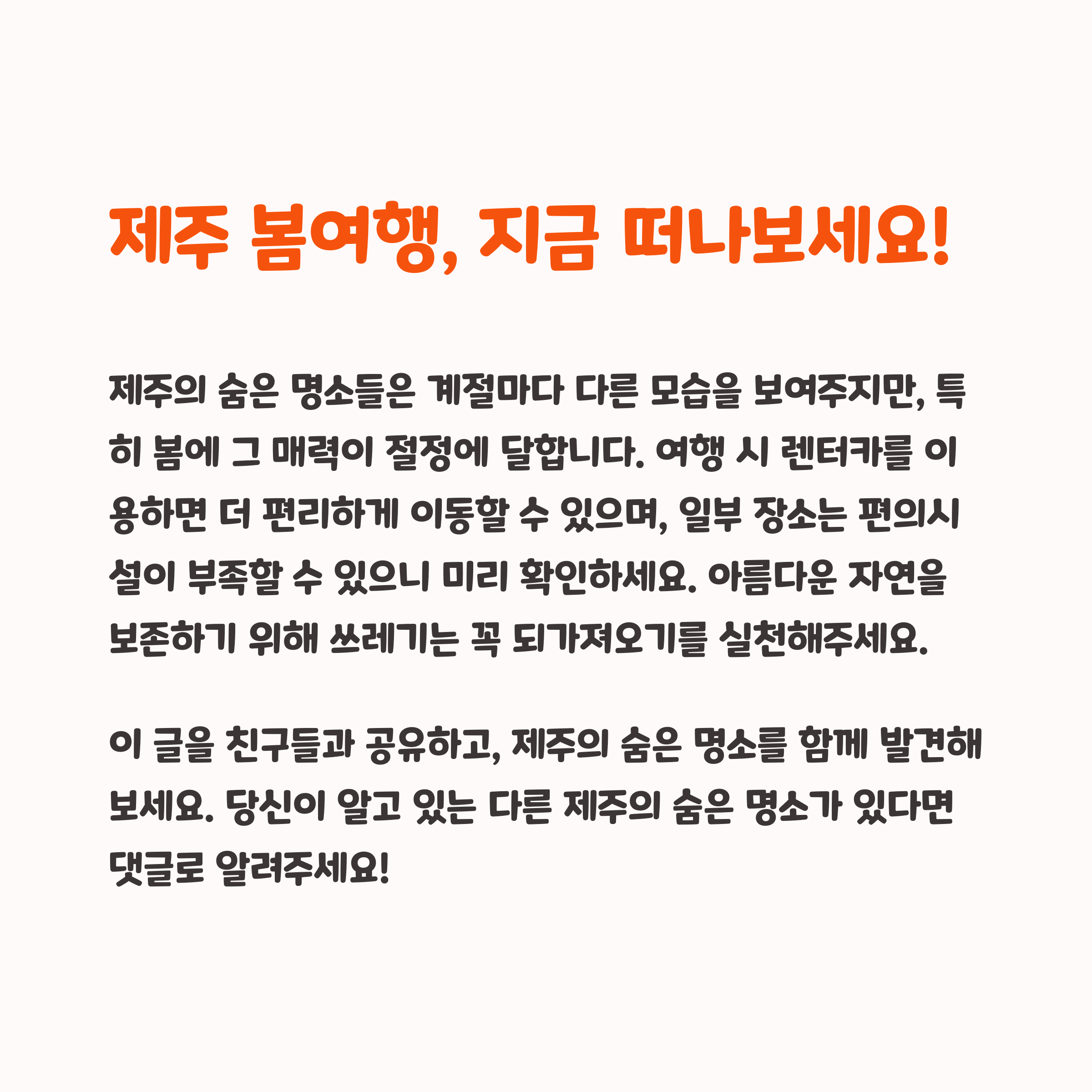 봄의 제주도는 그 자체로도 아름답지만, 사람이 적고 조용한 숨은 명소들을 찾는다면 진짜 힐링을 경험할 수 있습니다. 선흘, 하도, 오조리 같은 로컬 지역을 천천히 걸어보며 제주의 속살을 느껴보세요. 관광지보다 더 제주다운 장소에서 진짜 나만의 여행을 만들어 보세요. 지금 지도 앱에 저장해두는 걸 추천드립니다!