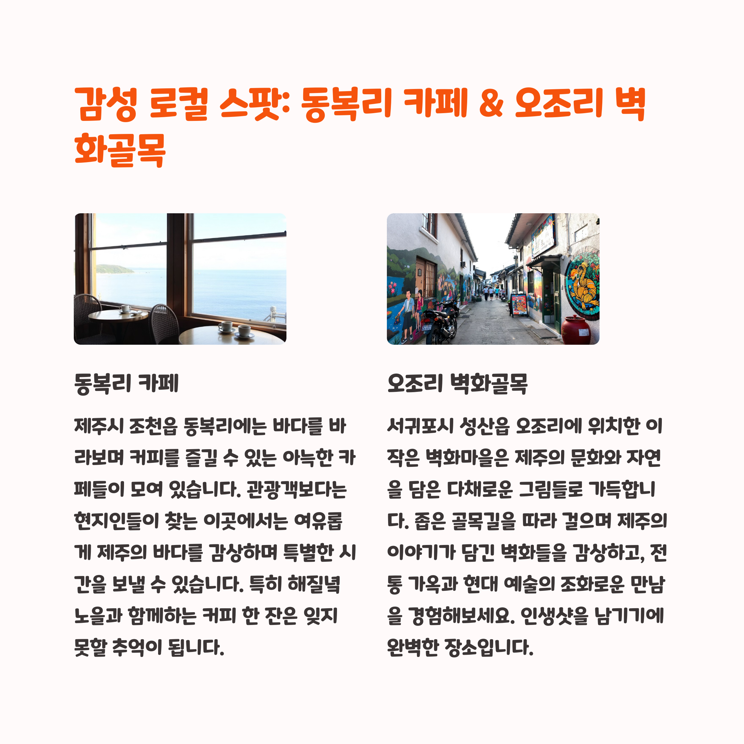 성산 근처의 오조리 벽화길은 조용한 산책과 포토 스팟으로 딱입니다. 소규모 아트 프로젝트로 꾸며져 특별한 분위기를 자아냅니다.
