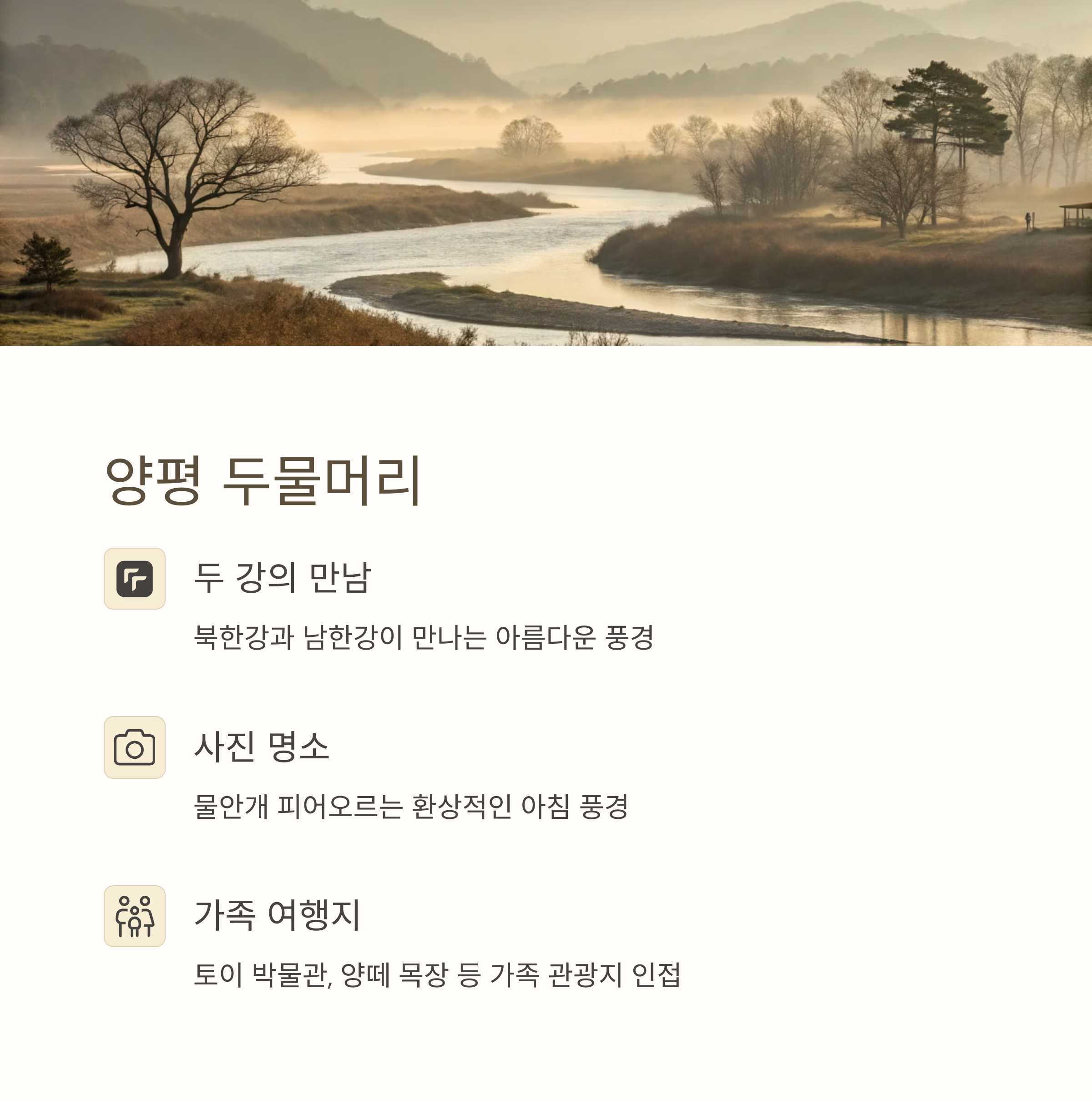 양평의 대표적인 관광지인 두물머리는 북한강과 남한강이 만나는 곳으로 물안개가 피어오르는 아침이면 그 환상적인 광경을 촬영하려는 아마추어 사진가들이 몰릴 만큼 매력적인 풍경을 선사해요. 주변의 세미원이나 양평들꽃수목원은 단아한 매력을 느낄 수 있는 공간인 데다, 아이들이 좋아할 만한 관광지인 토이 박물관이나 양떼 목장도 있어 특히 가족 단위 관광객들에게 추천해요.
