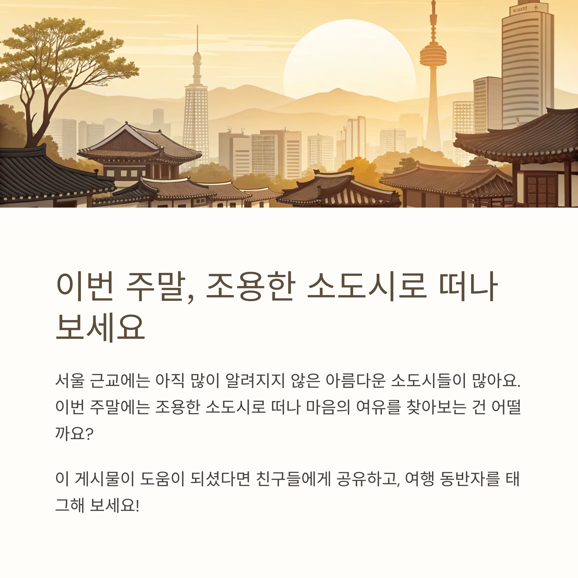 서울 근교에는 아직 많이 알려지지 않은 아름다운 소도시들이 많아요. 이번 주말에는 조용한 소도시로 떠나 마음의 여유를 찾아보는 건 어떨까요?