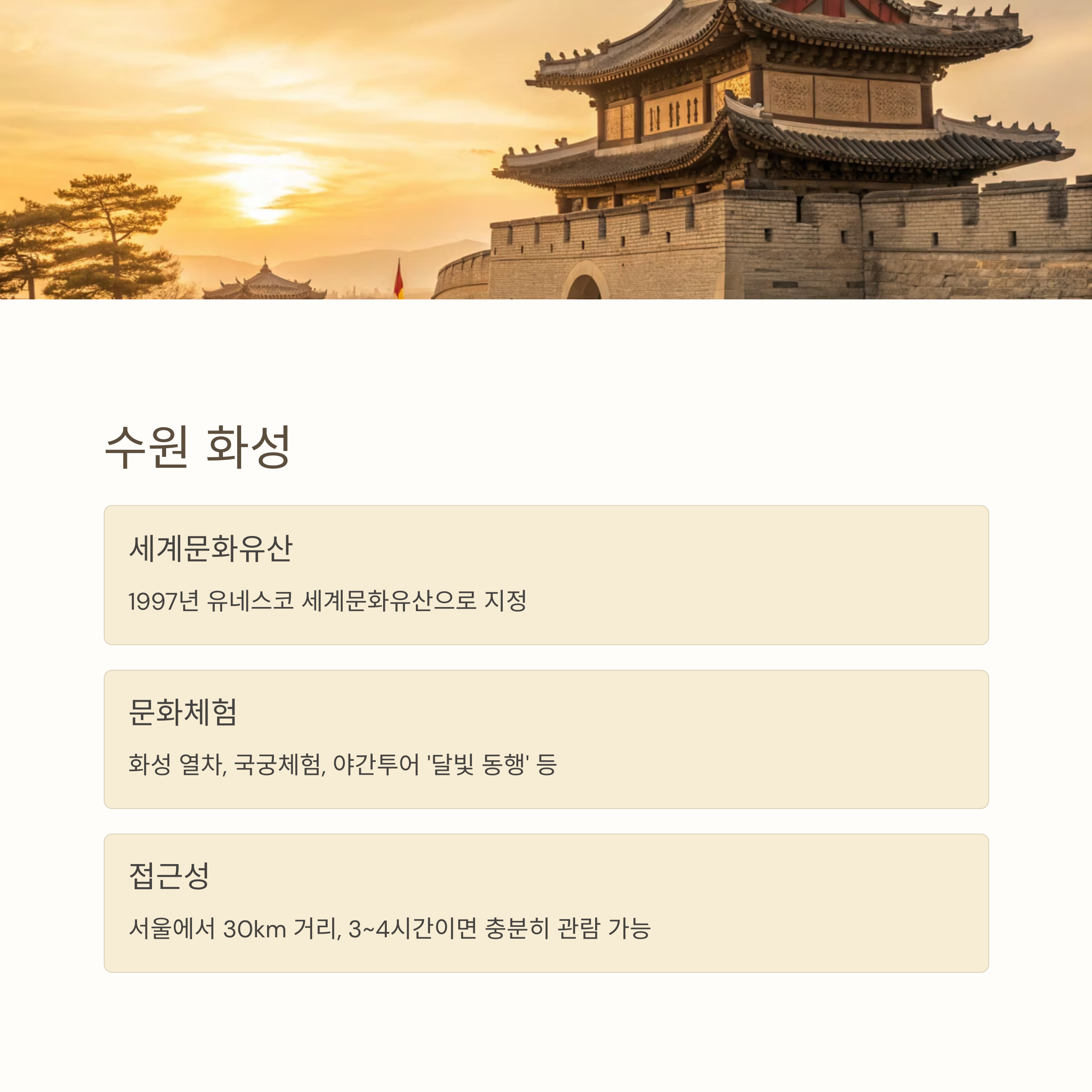 수원은 서울에서 불과 30km 거리에 있어 당일치기 여행지로 안성맞춤이다. ‘수원’하면 제일 먼저 떠오르는 수원화성은 그 역사 문화적 가치를 인정받아 1997년 유네스코 세계문화유산으로 지정됐다. 애니메이션 관람, 화성 열차, 국궁체험, 화성행궁 체험, 야간투어 ‘달빛 동행’ 등 풍성한 문화체험 프로그램이 마련돼있으니 미리 알아보고 참가하는 것도 좋겠다. 약 3~4시간이면 충분히 둘러볼 수 있다.