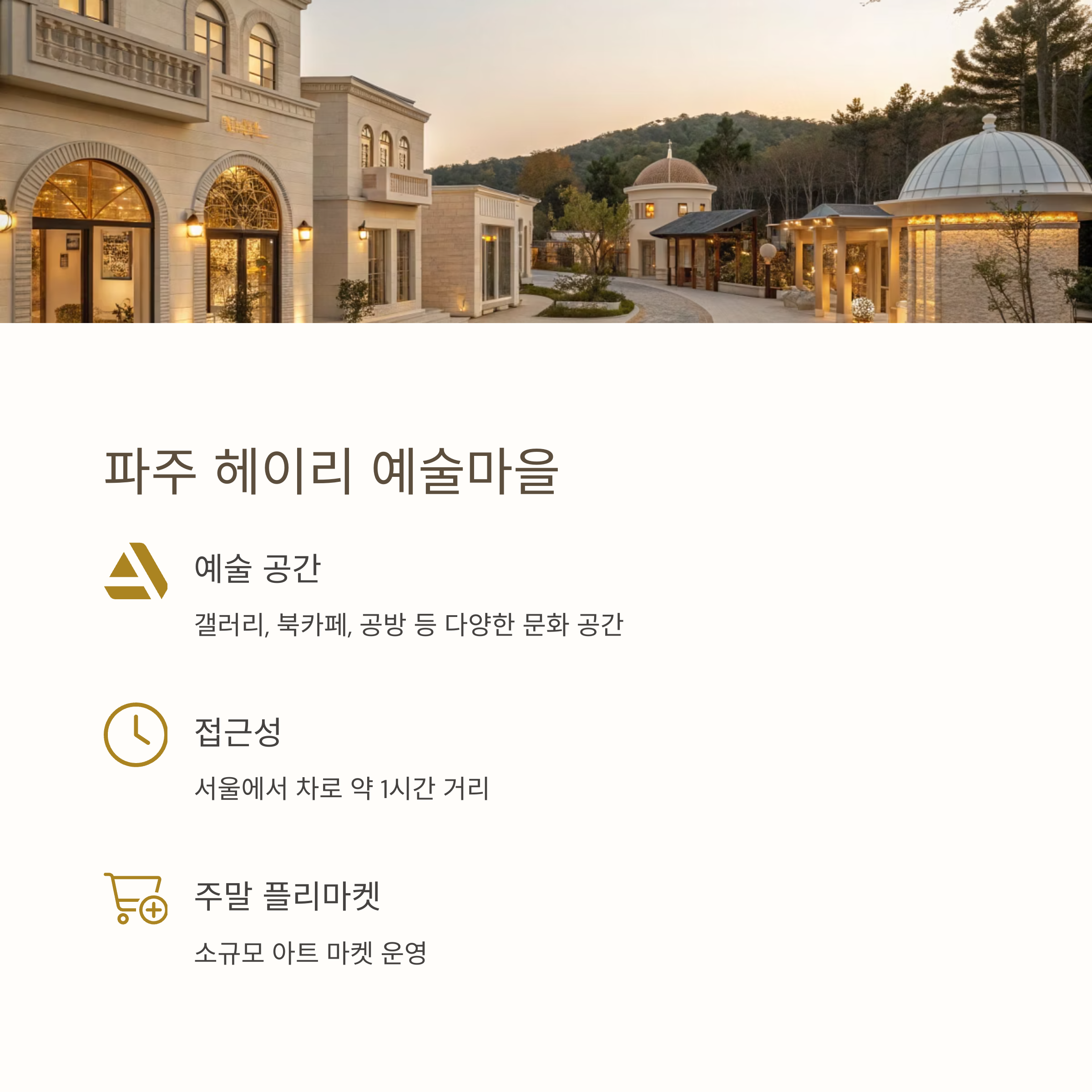 파주는 서울에서 차로 약 1시간 거리로, 예술과 자연이 공존하는 도시입니다. 특히 헤이리 예술마을은 파주를 대표하는 문화 예술의 중심지로, 예술작품과 감각적인 건축물이 조화를 이루는 곳입니다. 이곳에서는 갤러리, 북카페, 공방 등 다양한 공간을 만날 수 있으며, 산책로를 따라 걸으며 여유로운 시간을 보낼 수 있습니다. 특히, 주말마다 열리는 소규모 아트 플리마켓은 예술을 사랑하는 이들에게 흥미로운 경험을 제공합니다. 또한, 헤이리 근처에는 파주 출판도시와 임진각 평화누리 공원이 있어 함께 방문하기에 좋습니다. 파주는 자연 속에서 문화적인 감각을 즐기고 싶은 여행자들에게 딱 맞는 당일치기 여행지입니다.