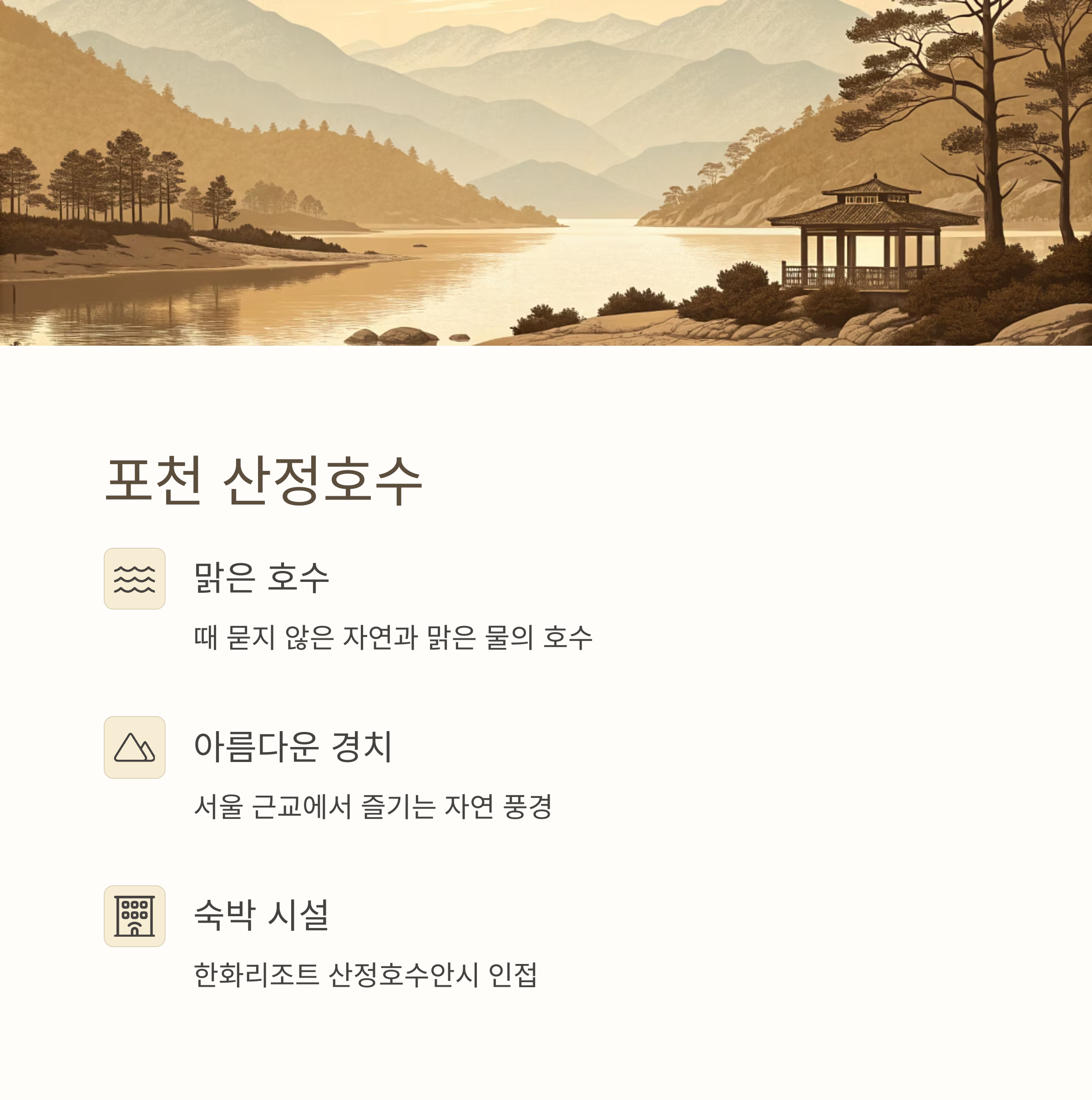 포천 산정호수는 경기 북부에 위치하고 있는 포천시에는 물 맑고 경치 좋은 산정호수가 자리 잡고 있다. 서울에서 가까운 거리에 때 묻지 않은 자연을 느껴볼 수 있어서 최근 서울 근교 당일치기 명소로 각광받고 있다. 산정호수 가까이에는 “한화리조트 산정호수안시”가 위치하고 있다. 당일치기를 넘어 하루 정도 숙박하고 싶을 때 최적의 선택이 될 것이다.