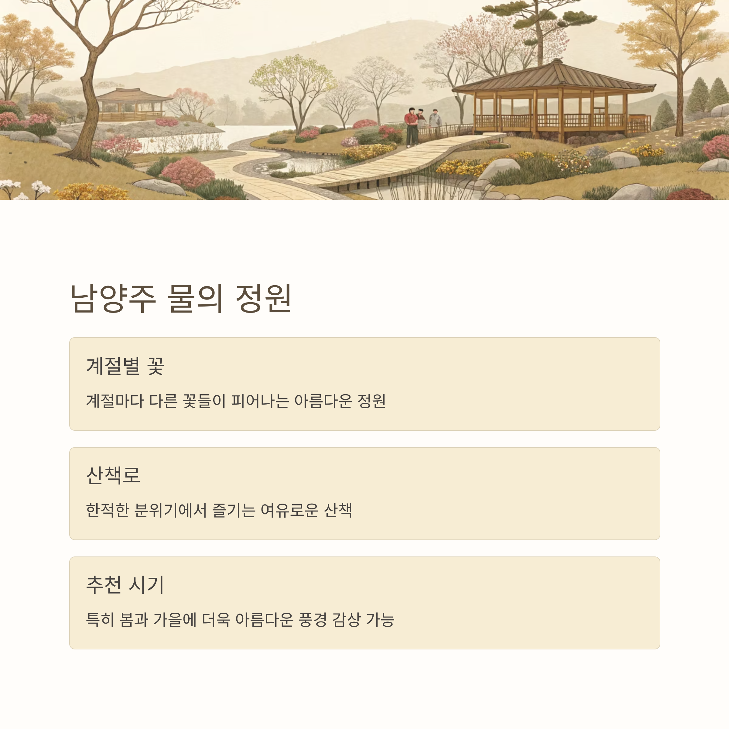 남양주에 위치한 물의 정원은 한적한 산책로와 자연을 즐길 수 있는 곳입니다. 계절마다 다른 꽃들이 피어나는 이곳은 조용한 분위기에서 산책을 즐기기에 안성맞춤입니다. 특히 봄과 가을에는 더욱 아름다운 풍경을 감상할 수 있어요.