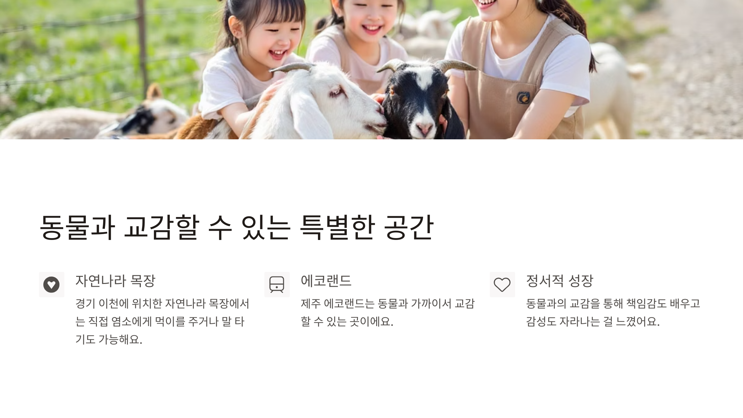 🦙 경기 이천의 ‘자연나라 목장’, 제주 ‘에코랜드’는 동물과 가까이서 교감할 수 있는 곳이에요. 특히 자연나라 목장에서는 직접 염소에게 먹이를 주거나 말 타기도 가능해서 아이들이 정말 좋아해요. 단순히 보는 동물원이 아니라, 직접 만지고 체험할 수 있다는 점에서 차별화됩니다. 동물과의 교감을 통해 책임감도 배우고 감성도 자라나는 걸 느꼈어요 🐐