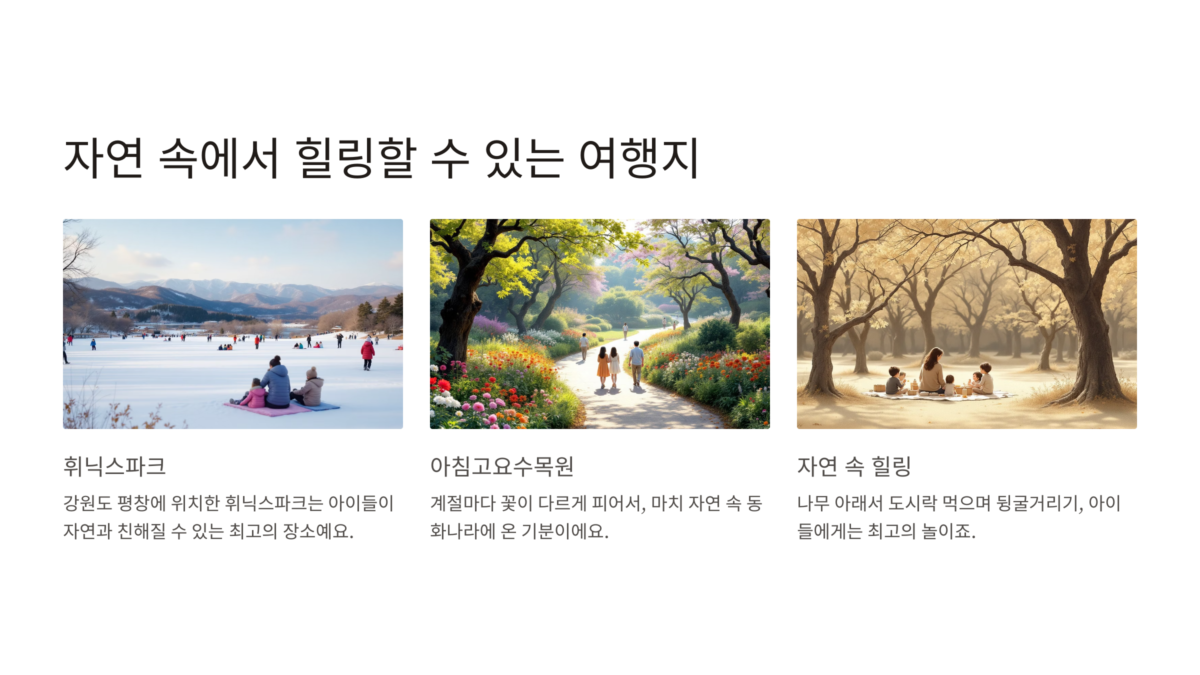 📍 강원도 평창 ‘휘닉스파크’, 경기도 가평 ‘아침고요수목원’은 아이들이 자연과 친해질 수 있는 최고의 장소예요. 특히 아침고요수목원은 계절마다 꽃이 다르게 피어서, 마치 자연 속 동화나라에 온 기분이에요. 나무 아래서 도시락 먹으며 뒹굴거리기, 아이들에게는 최고의 놀이죠. 자연에서 뛰놀며 에너지를 발산하는 아이를 보면, 부모 마음도 힐링됩니다 🍀