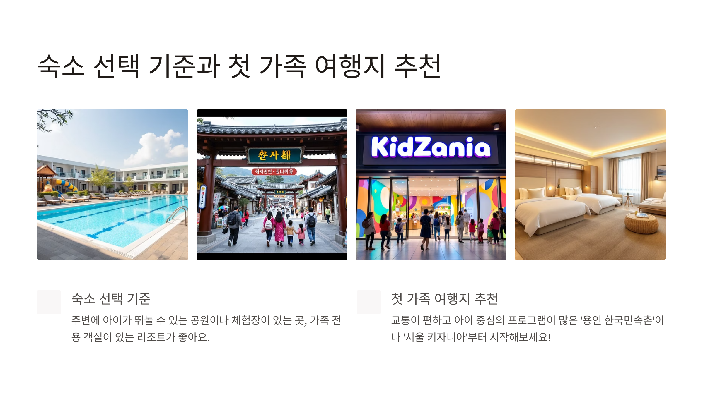 👉 주변에 아이가 뛰놀 수 있는 공원이나 체험장이 있는 곳, 가족 전용 객실이 있는 리조트가 좋아요.