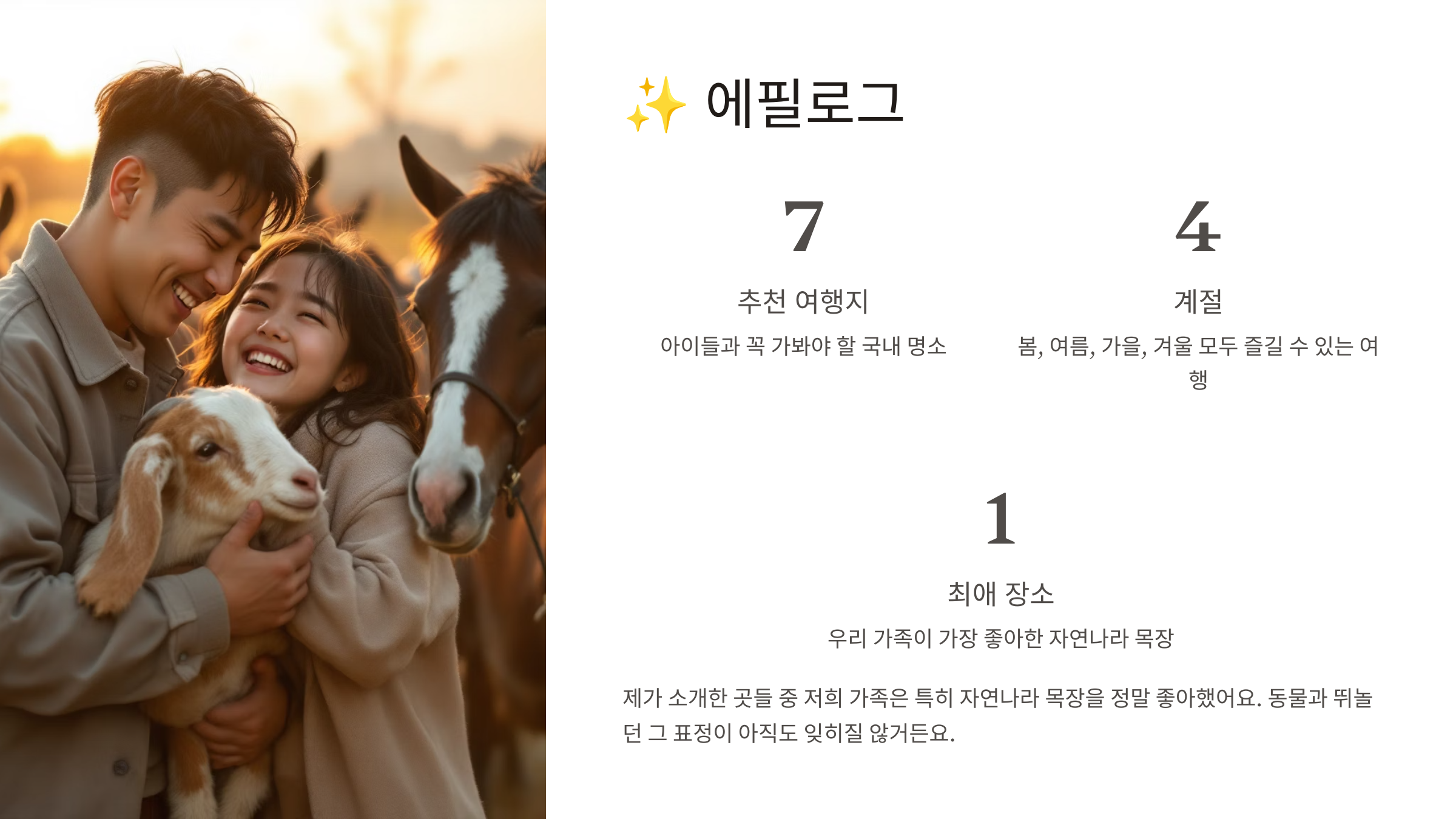 제가 소개한 곳들 중 저희 가족은 특히 자연나라 목장을 정말 좋아했어요. 동물과 뛰놀던 그 표정이 아직도 잊히질 않거든요. 여행은 우리 가족에게 소중한 추억을 쌓게 해주는 최고의 도구예요. 다음 글에서는 계절별 추천 여행지로 다시 찾아뵐게요! 🌸❄️🌞🍁