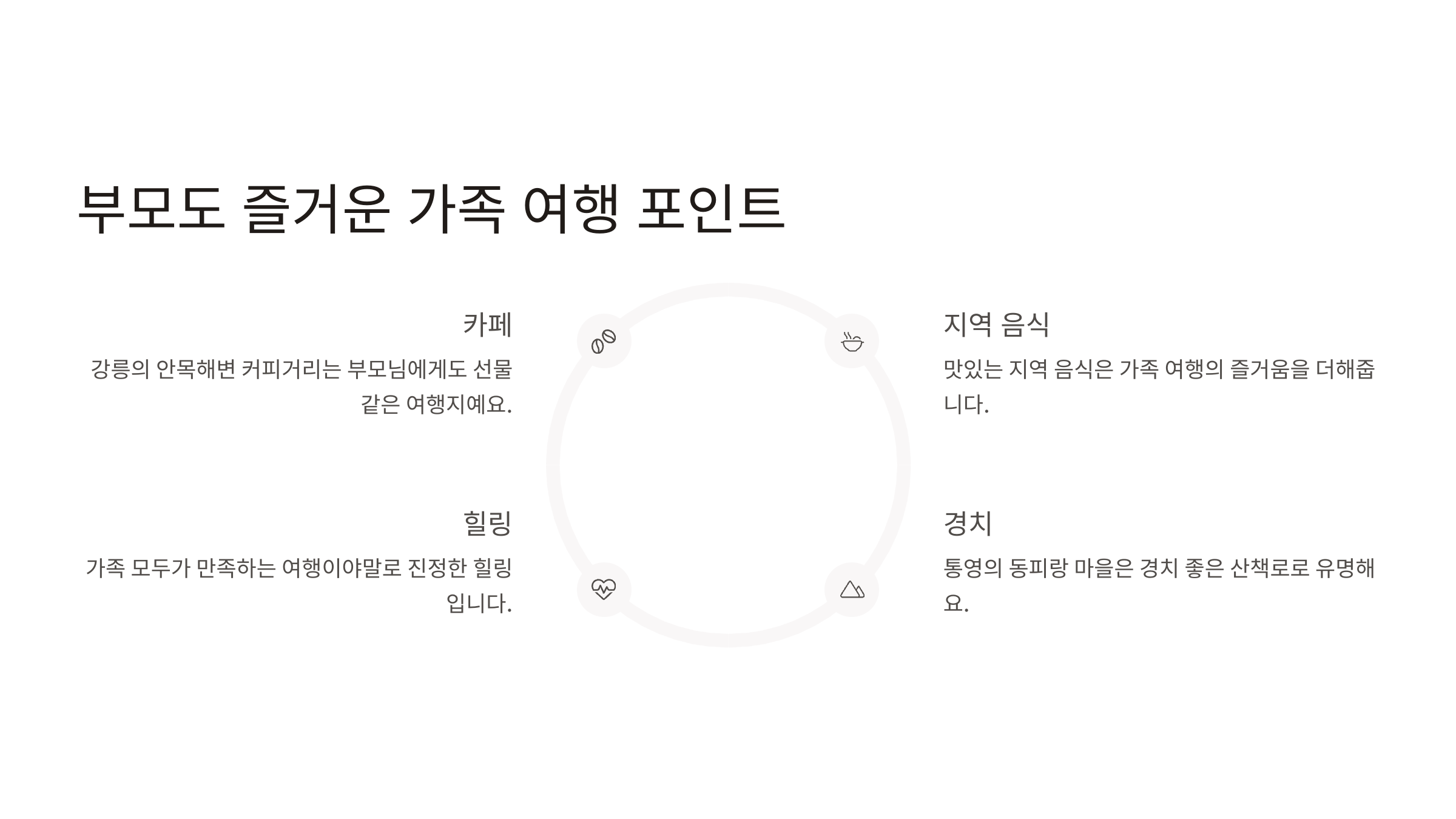 없죠. 강릉의 안목해변 커피거리, 통영의 동피랑 마을은 부모님에게도 선물 같은 여행지예요. 아이들이 뛰노는 동안 커피 한 잔 하며 여유를 즐길 수 있는 공간이 있는지 꼭 확인하세요. 가족 모두가 만족하는 여행이야말로 진정한 힐링입니다 ❤️
