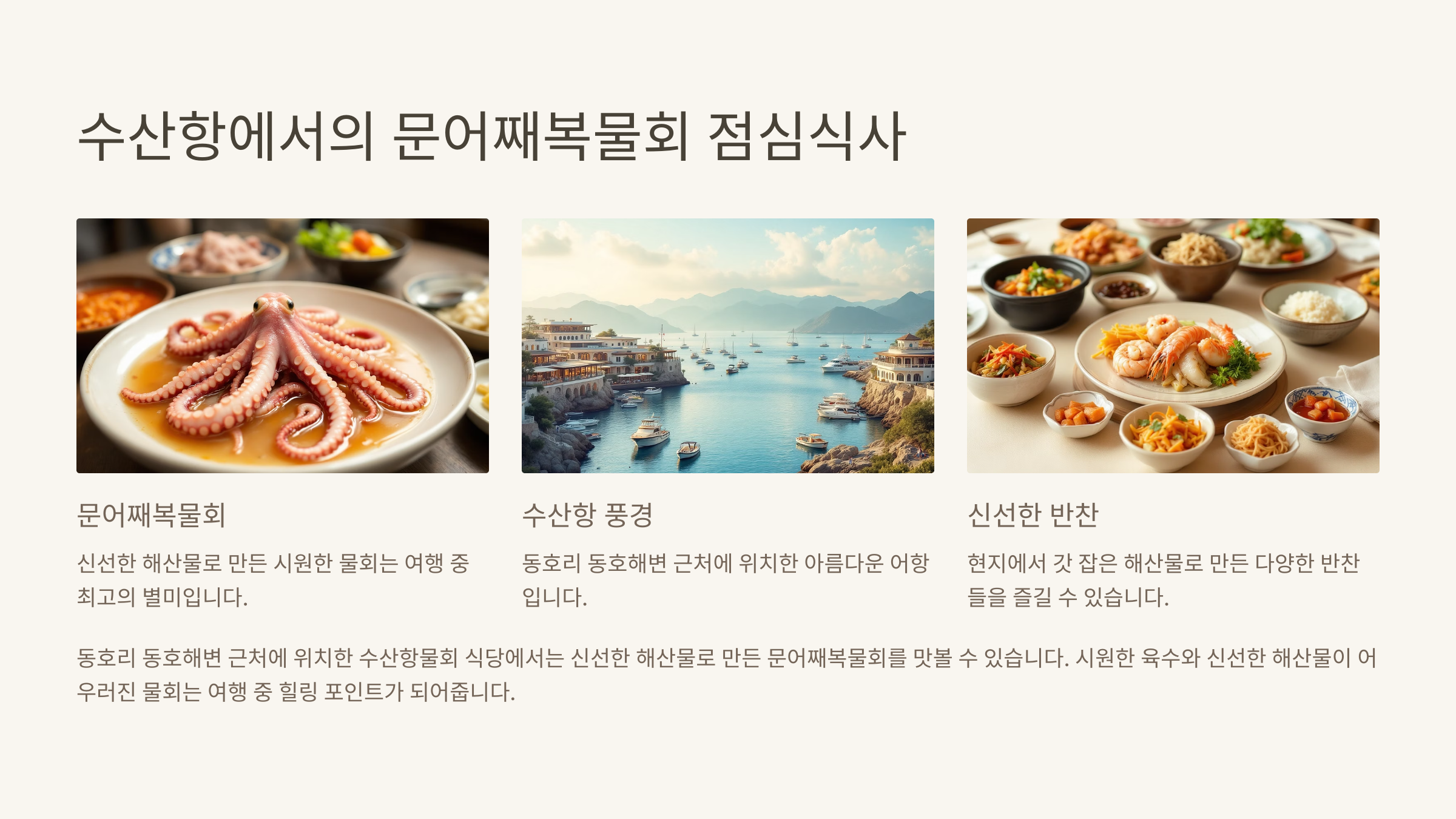 동호리 동호해변 근처에 위치한 수산항물회 식당에서는 신선한 해산물로 만든 문어째복물회를 맛볼 수 있습니다. 시원한 육수와 신선한 해산물이 어우러진 물회는 여행 중 힐링 포인트가 되어줍니다.