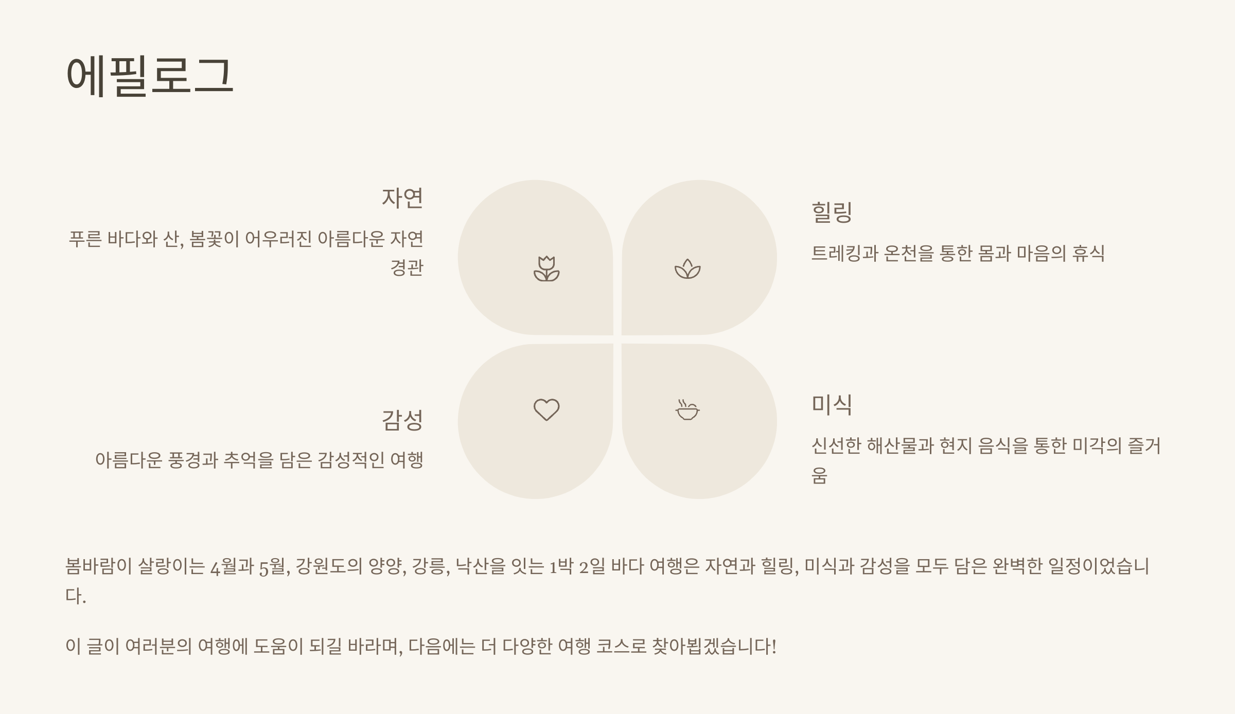 봄바람이 살랑이는 4월과 5월, 강원도의 양양, 강릉, 낙산을 잇는 1박 2일 바다 여행은 자연과 힐링, 미식과 감성을 모두 담은 완벽한 일정이었습니다. 이 글이 여러분의 여행에 도움이 되길 바라며, 다음에는 더 다양한 여행 코스로 찾아뵙겠습니다!