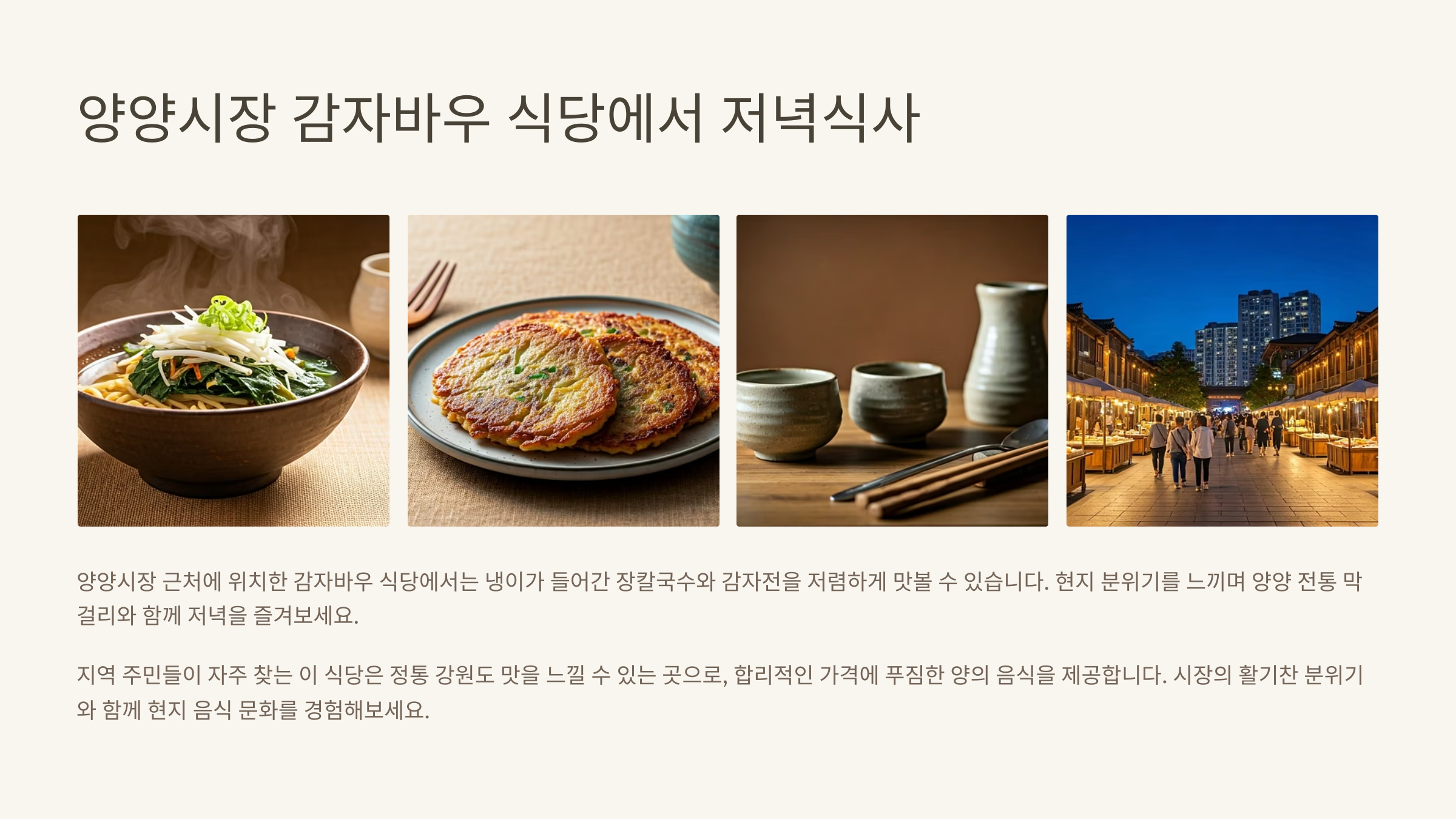 양양시장 근처에 위치한 감자바우 식당에서는 냉이가 들어간 장칼국수와 감자전을 저렴하게 맛볼 수 있습니다. 현지 분위기를 느끼며 양양 전통 막걸리와 함께 저녁을 즐겨보세요.