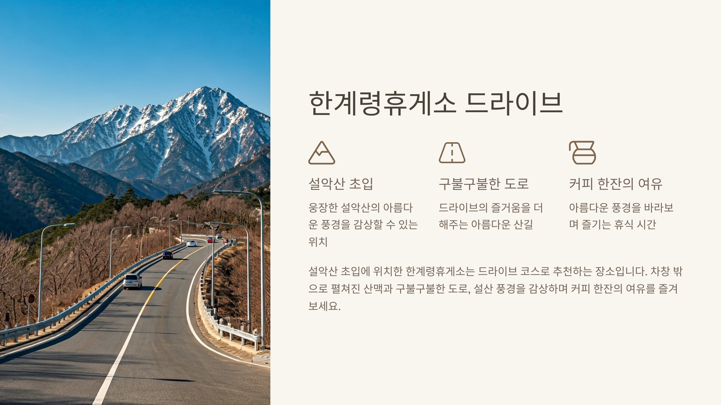 설악산 초입에 위치한 한계령휴게소는 드라이브 코스로 추천하는 장소입니다. 차창 밖으로 펼쳐진 산맥과 구불구불한 도로, 설산 풍경을 감상하며 커피 한잔의 여유를 즐겨보세요.