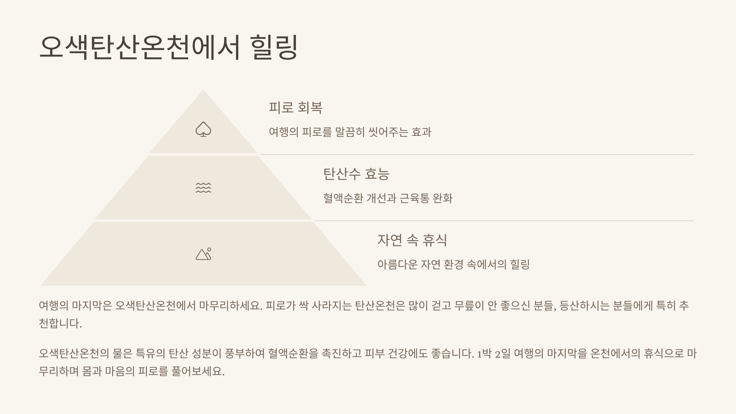 여행의 마지막은 오색탄산온천에서 마무리하세요. 피로가 싹 사라지는 탄산온천은 많이 걷고 무릎이 안 좋으신 분들, 등산하시는 분들에게 특히 추천합니다.