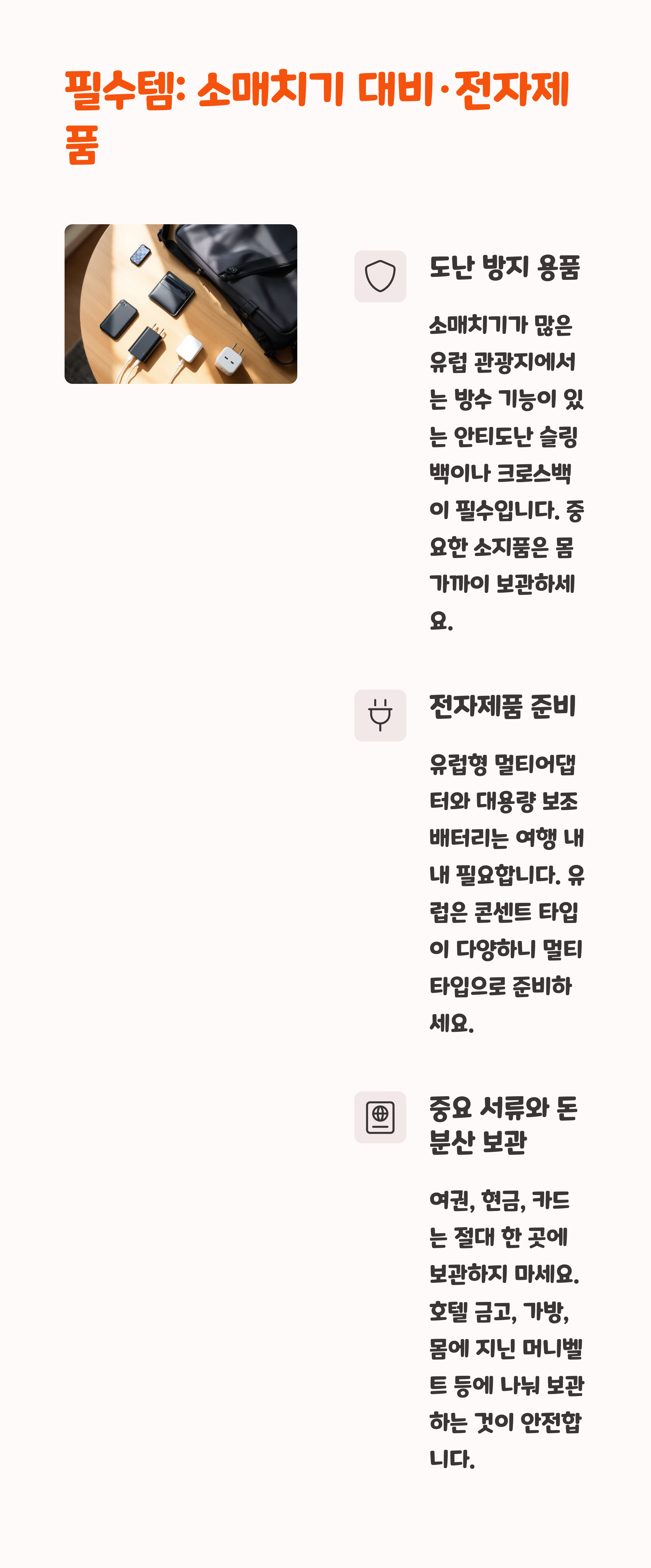 슬링백, RFID지갑, 에어태그, 자물쇠 등 소매치기 예방 아이템도 필수입니다.