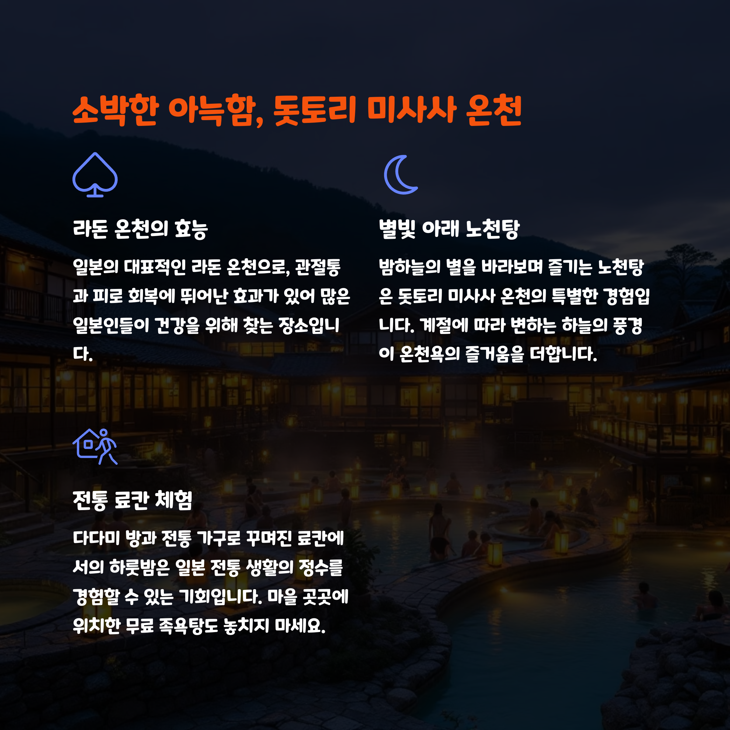 추천 포인트 조용한 자연 풍경, 소박한 온천, 전통 장터