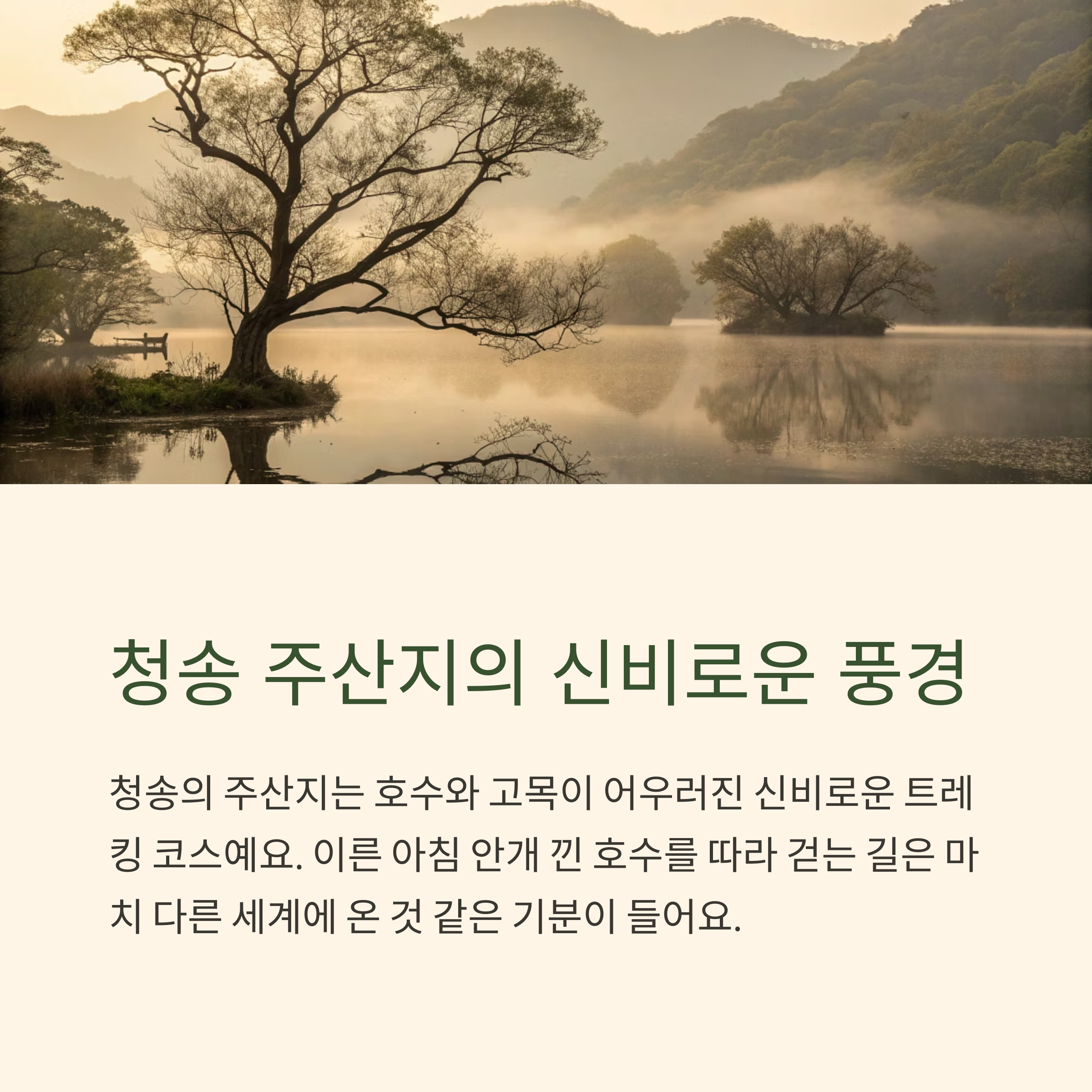 청송의 주산지는 호수와 고목이 어우러진 신비로운 트레킹 코스예요.