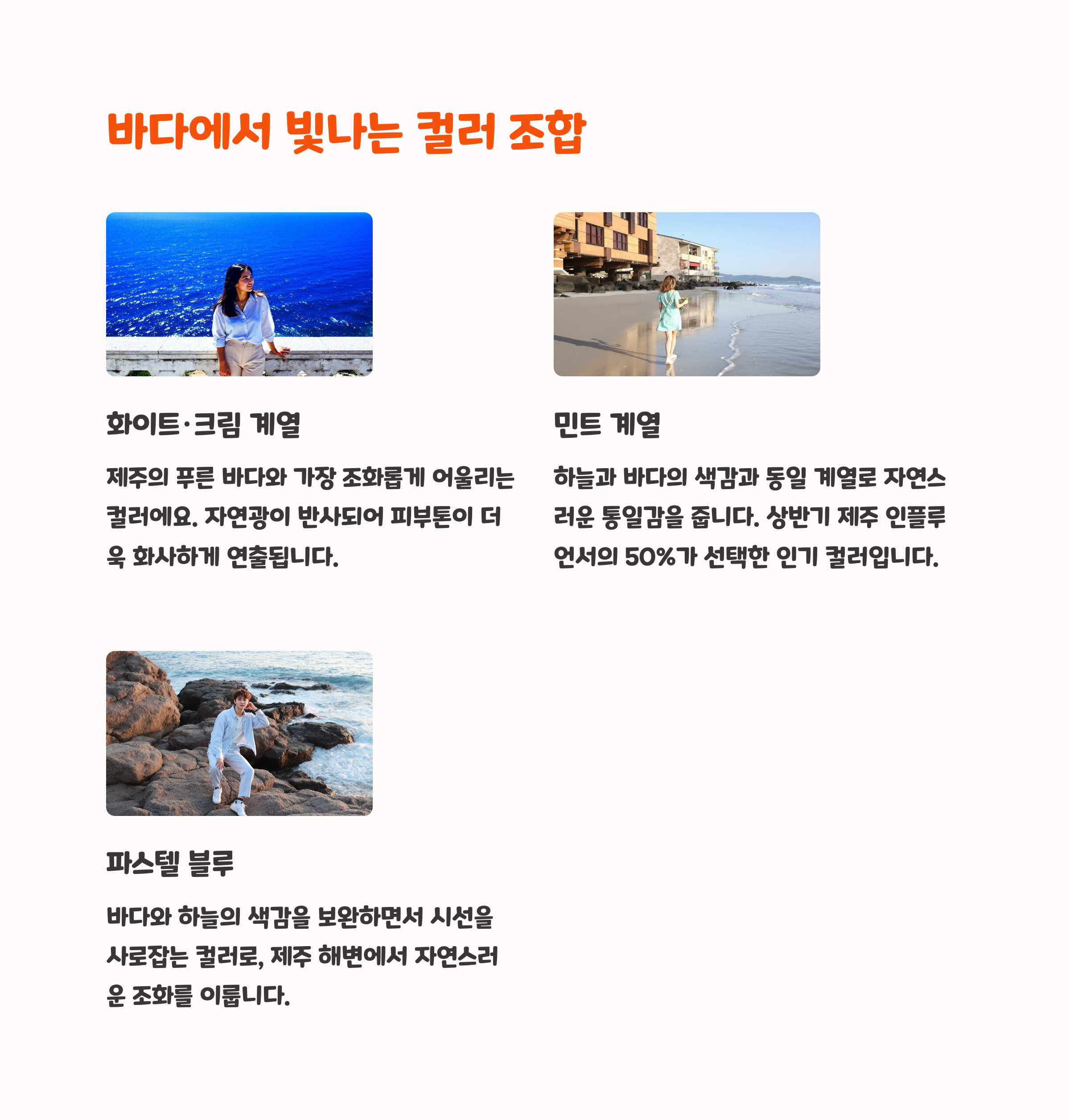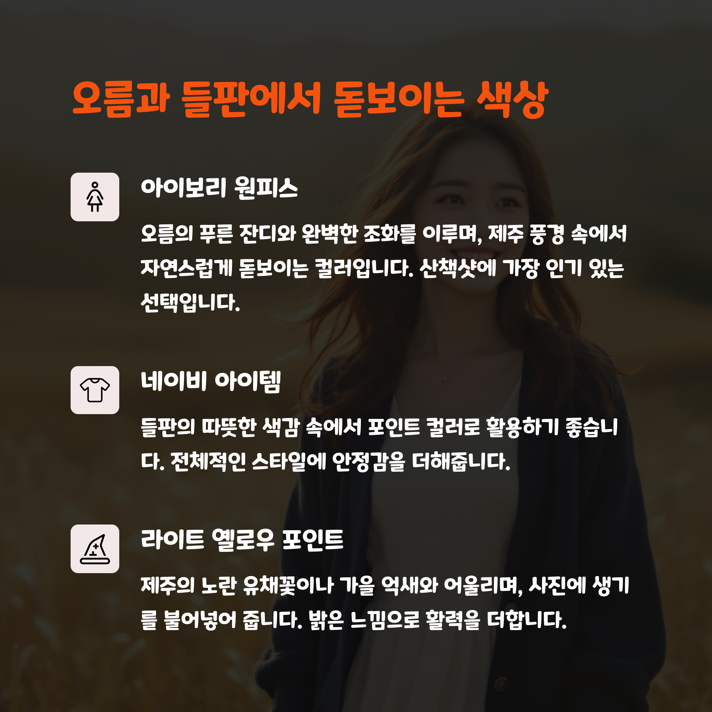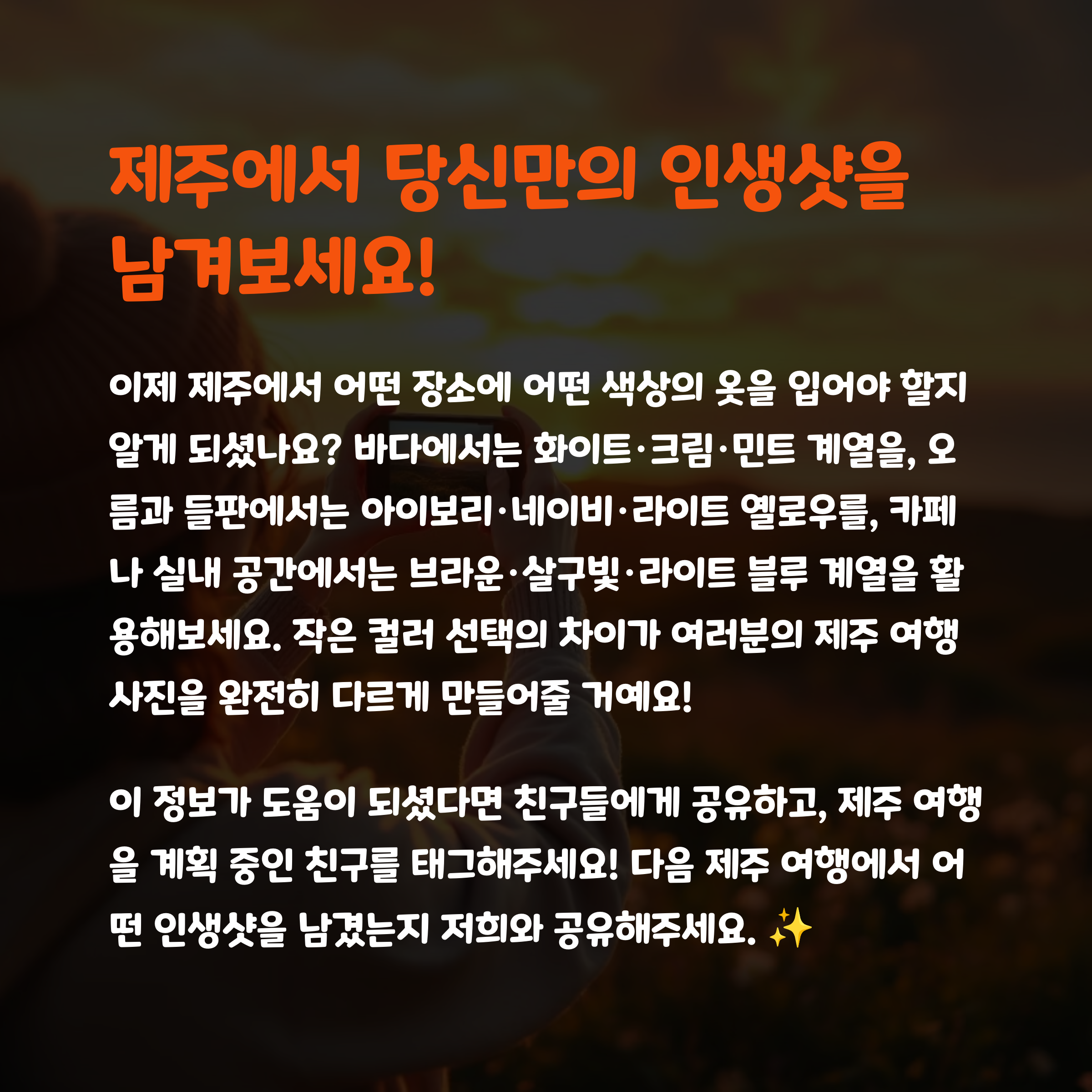 이번 글에서는 제주 풍경과 조화를 이루면서도 인생샷을 남기기 좋은 옷 색깔 조합을 알려드립니다.