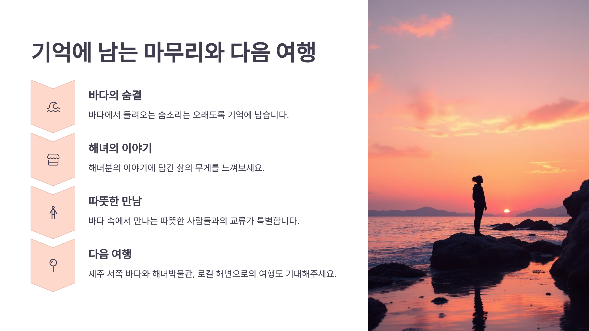 그리고 중요한 건, 마음가짐이에요. 바다에 들어가기 전엔 자연을 존중하는 태도, 해녀분들의 이야기를 귀 기울이는 자세가 꼭 필요하답니다. 덤으로 카메라도 꼭 챙기세요. 사진 찍기 딱 좋은 스팟이 넘쳐나요!
