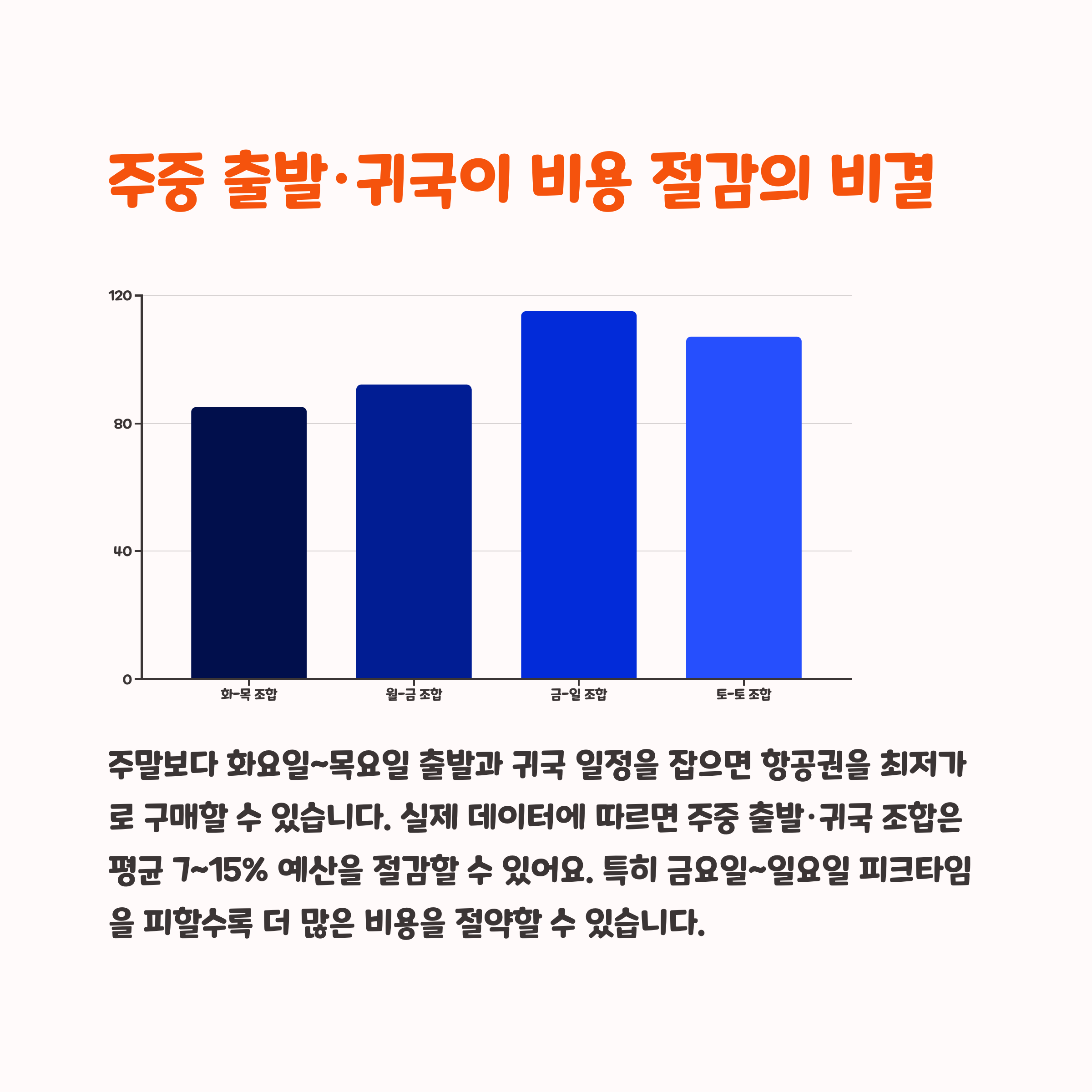 쉽고 비용도 저렴해요. 가족 단위 여행자는 보통 주말~주말로 계획하기 때문에, 주중 출발·귀국이 훨씬 가성비 있습니다.