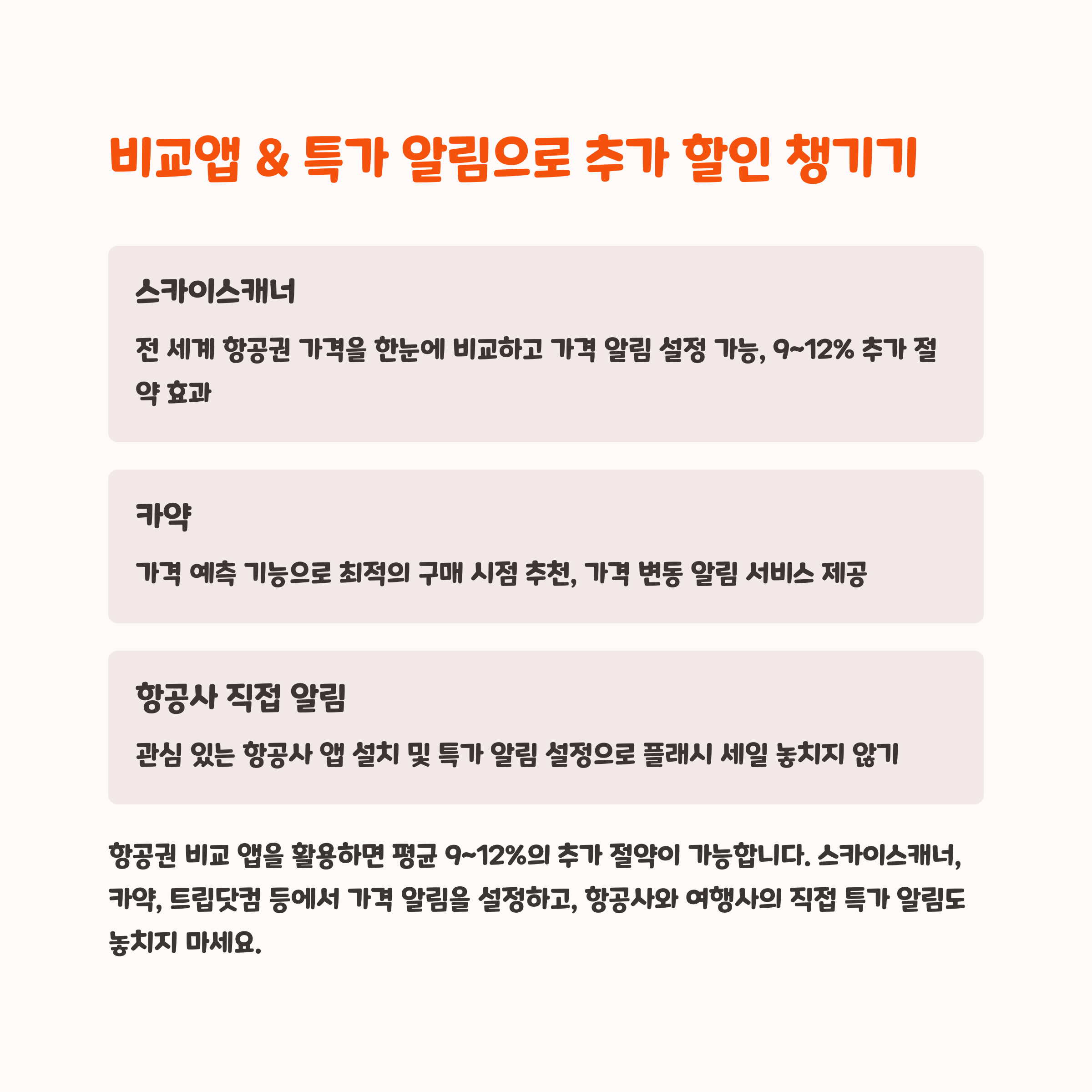 이 외에도, 구글 플라이트로 예비 검색 후 스카이스캐너나 실제 항공사 앱에서 예약하는 조합이 가성비 좋습니다.
