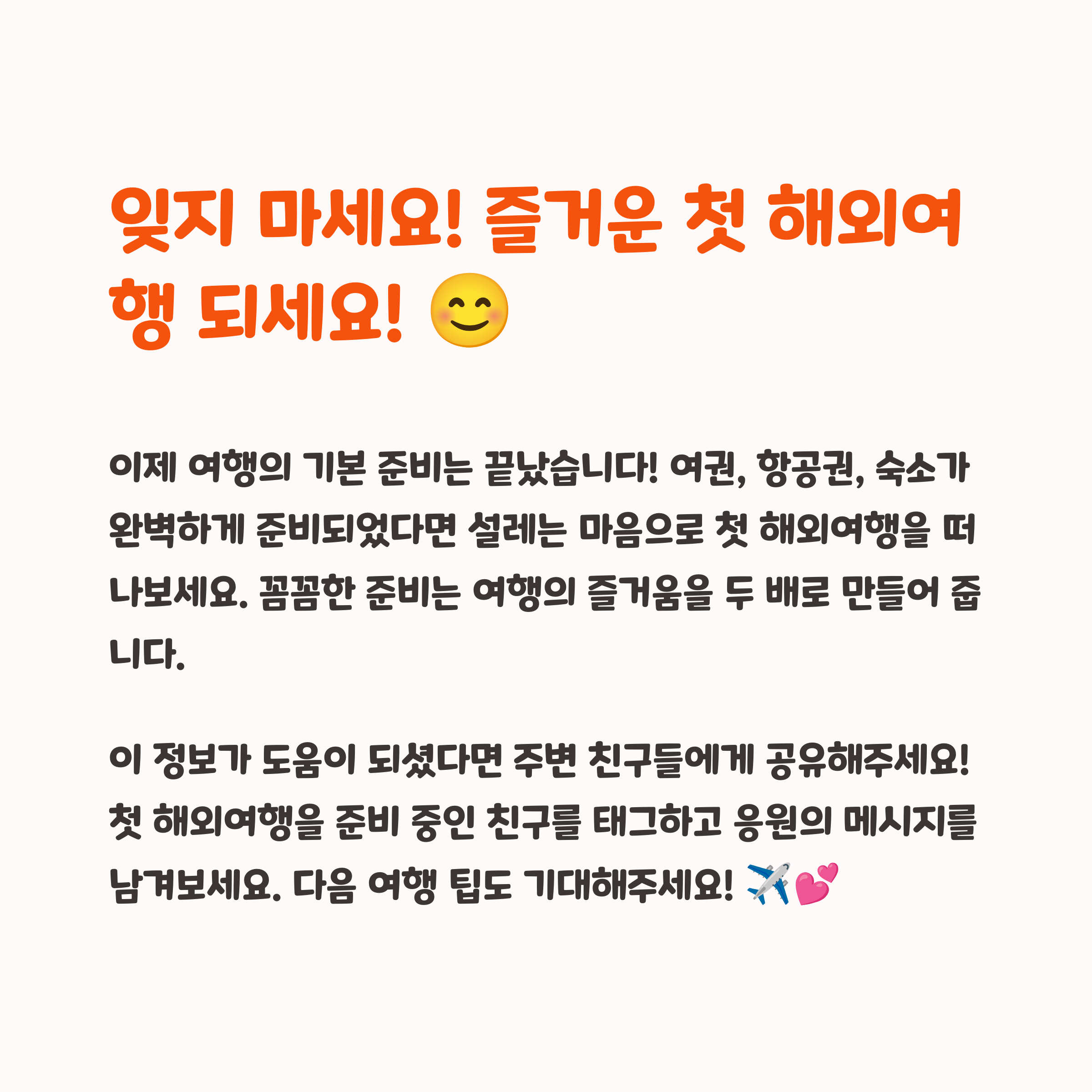 첫 해외 자유여행은 막연한 걱정보다 구체적인 준비가 핵심입니다. 여권의 유효기간 확인, 합리적인 항공권 예약, 위치 좋은 숙소 선택만으로도 여행의 절반은 성공한 셈이죠. 시작은 두렵지만, 차근차근 준비하면 누구나 즐겁고 안전한 자유여행을 떠날 수 있습니다. 지금 당장 여권부터 점검해보세요!