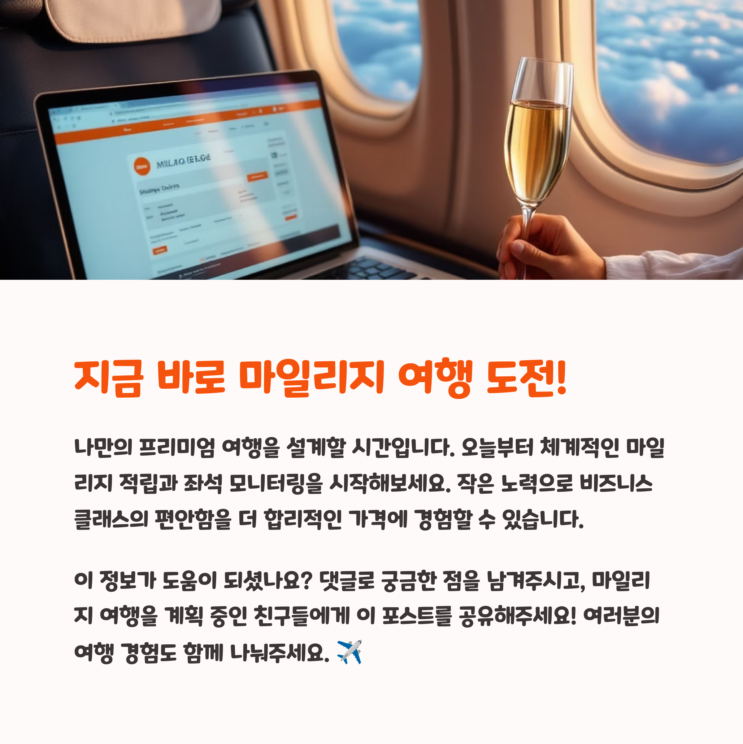 항공 마일리지를 제대로 활용하면 누구나 비즈니스 클래스의 프리미엄 혜택을 경험할 수 있습니다. 좌석 오픈 시기를 잘 파악하고 제휴 항공사, 카드 포인트 등을 적극 활용하면 효율적인 마일리지 사용이 가능합니다. 단순한 적립을 넘어, 여행 퀄리티를 높여주는 마일리지의 가치. 지금 바로 확인해보세요!