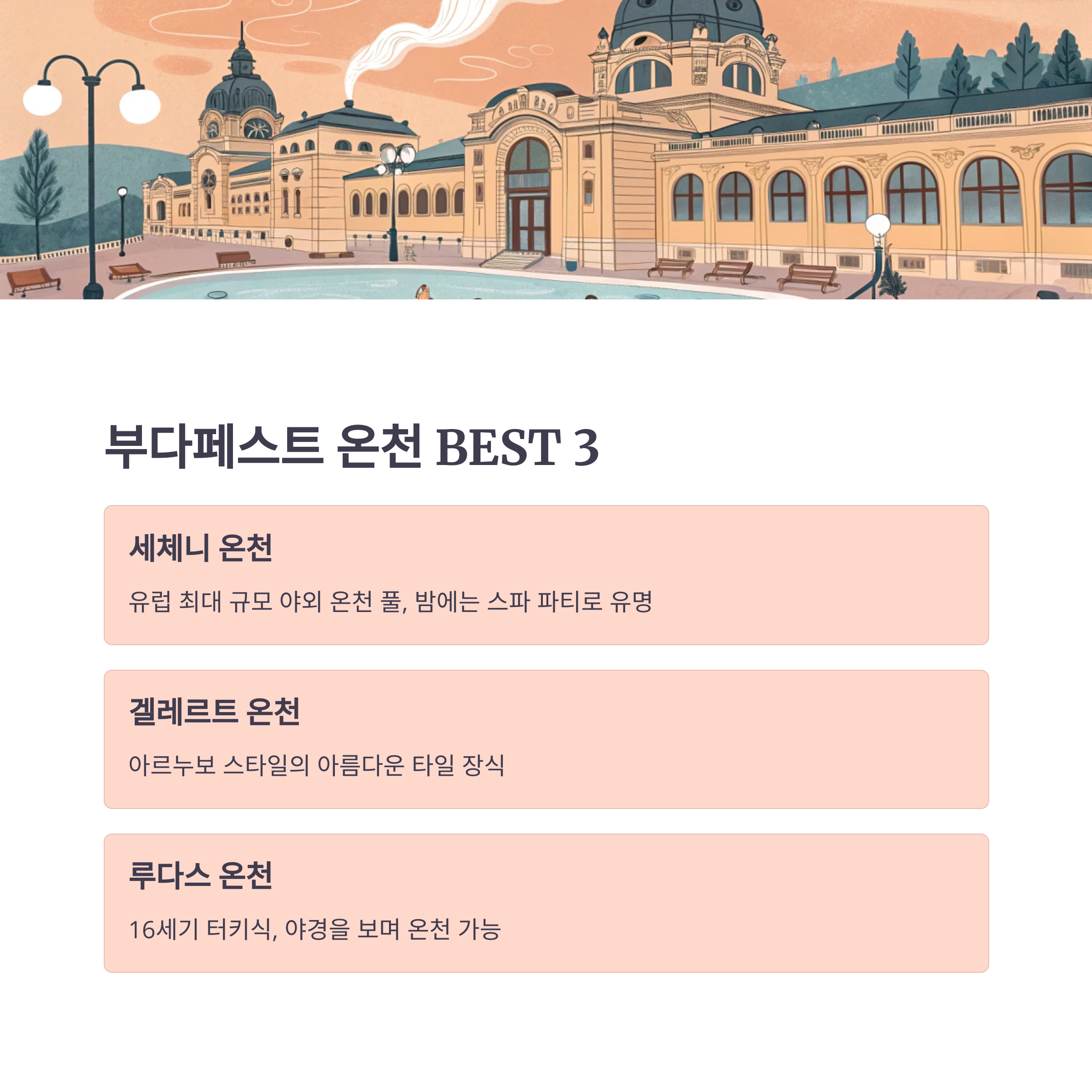 | 세체니 온천 | 유럽 최대 규모 | 야외 온천 풀, 다양한 사우나 |