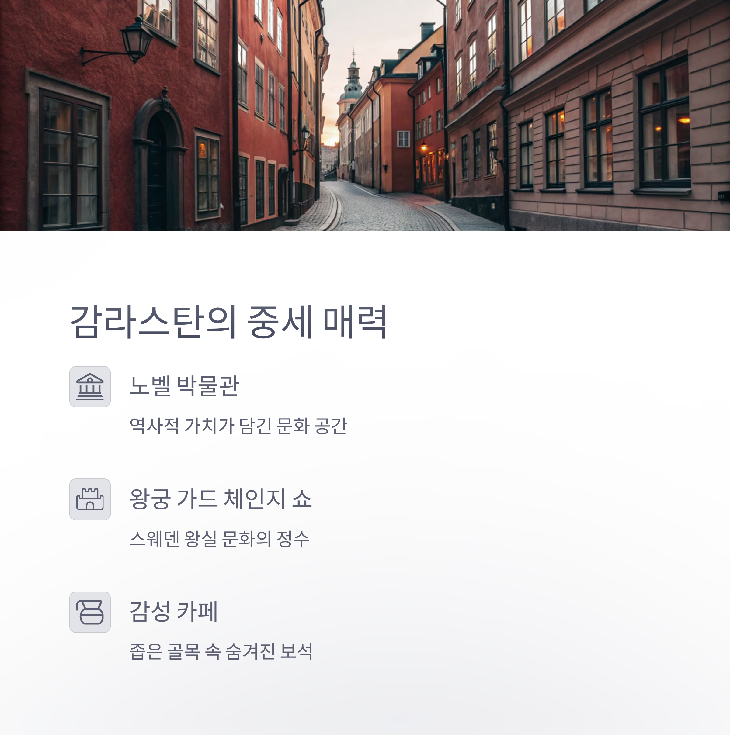 **감라스탄(Gamla Stan)**은 중세가 숨 쉬는 거리입니다.