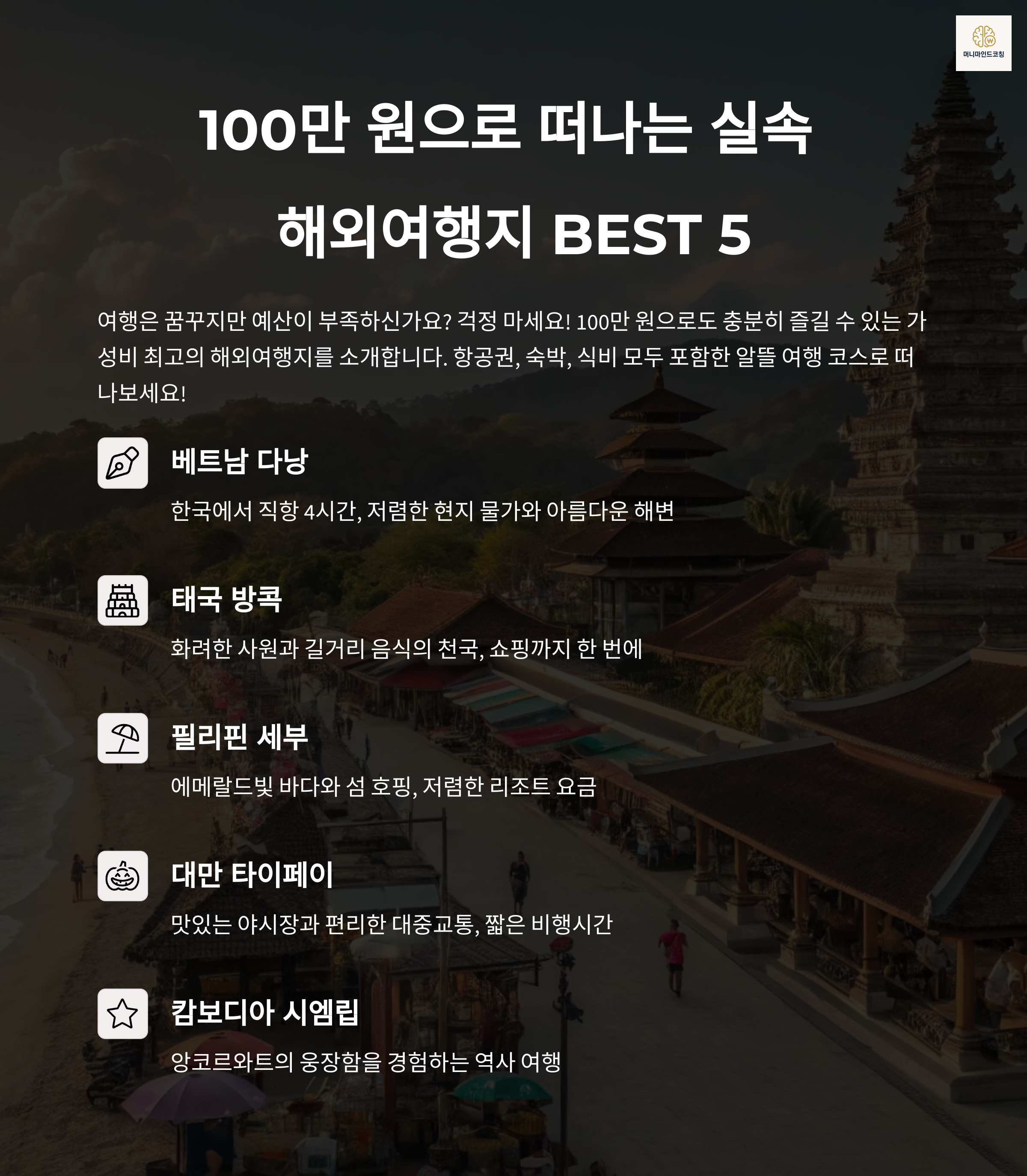 약 100만 원 예산으로도 충분히 만족스러운 해외여행이 가능합니다.