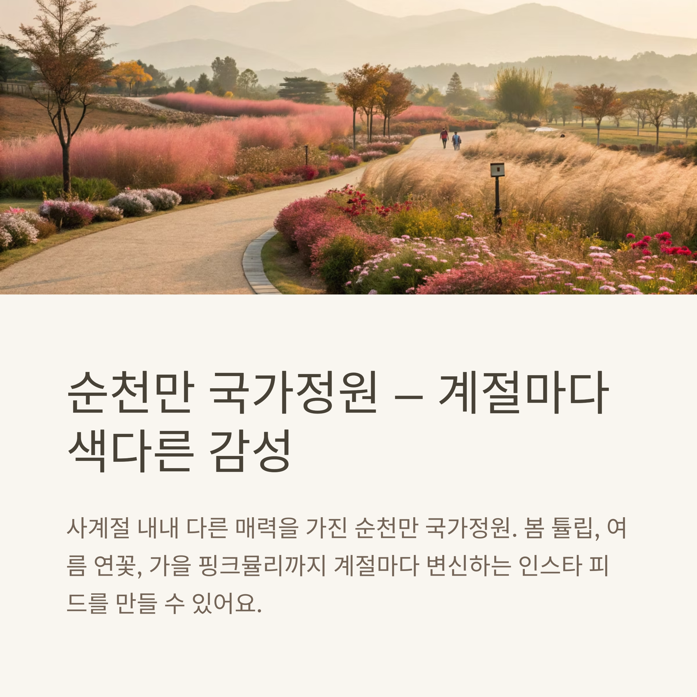봄엔 튤립, 여름엔 연꽃, 가을엔 핑크뮬리까지 인스타 피드가 계절 따라 변신하는 느낌이죠.