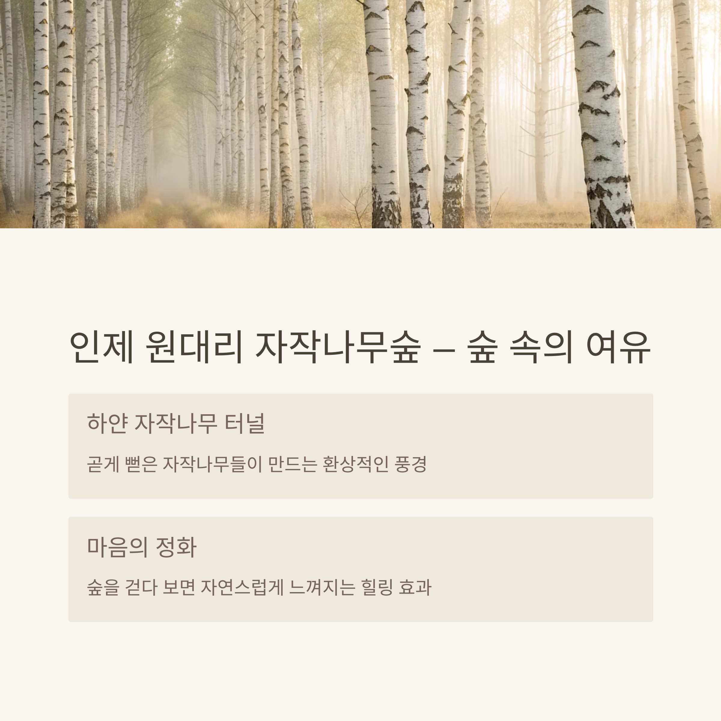 도심을 벗어나고 싶을 땐 강원도 인제 원대리의 자작나무숲을 추천드려요.