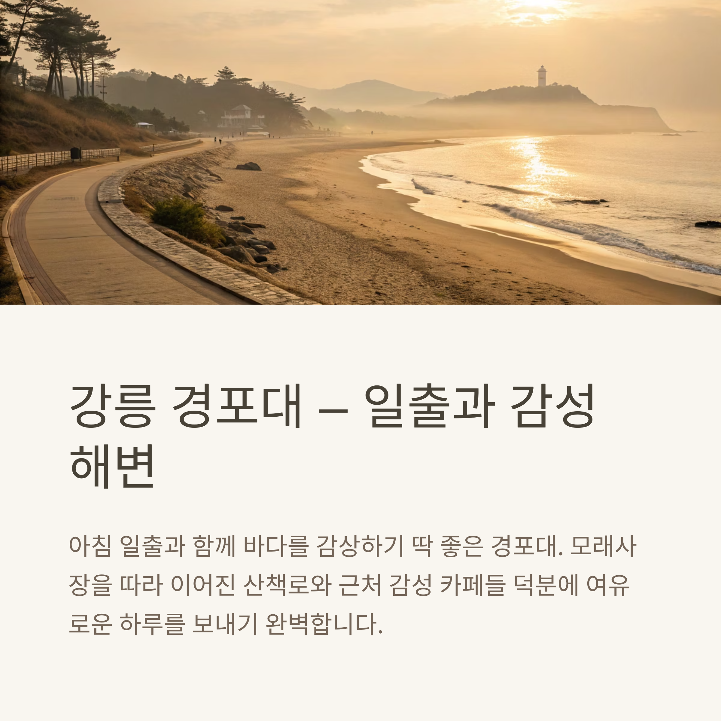 그중에서도 경포대는 아침 일출과 함께 바다를 감상하기 딱 좋은 장소예요.
