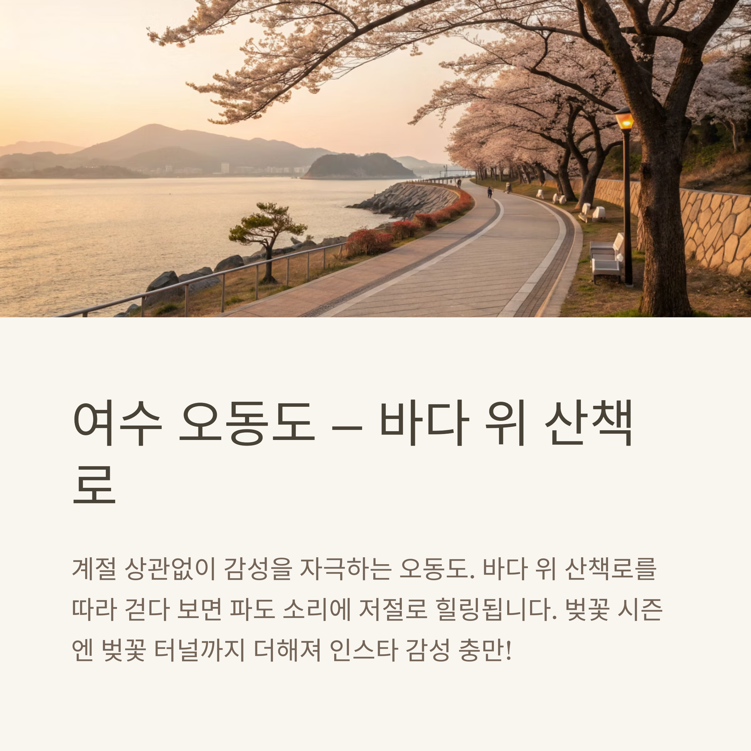 2025년 감성 충만 국내 여행지 TOP10! 여수 오동도부터 부여 궁남지까지, 인스타 감성 가득한 스폿으로 힐링과 추억을 동시에 즐겨보세요.