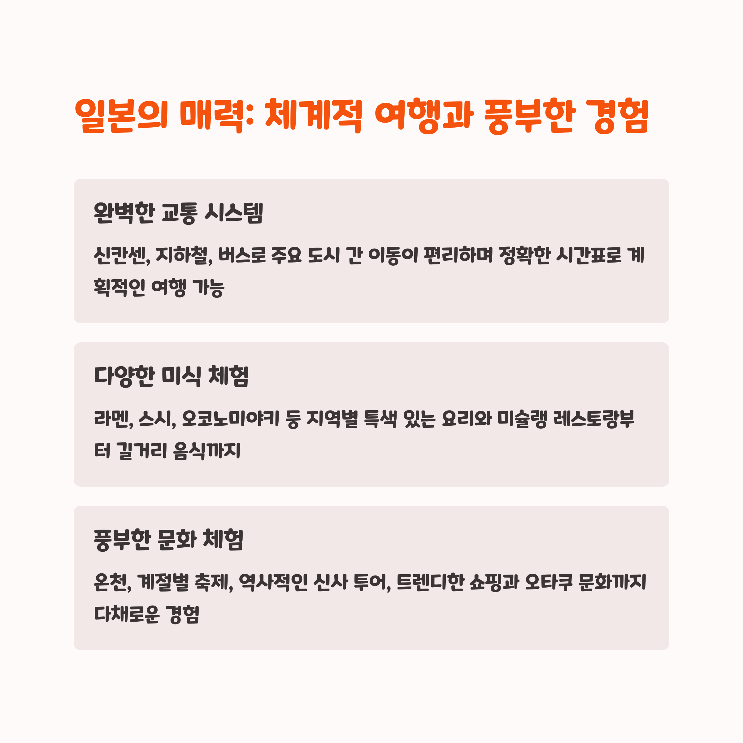 또한 일본은 계절마다 다른 매력을 뽐냅니다. 봄에는 벚꽃, 여름엔 축제, 가을엔 단풍, 겨울엔 온천이 있어 어떤 계절에 가도 만족도가 높습니다. 쇼핑과 온천, 역사적인 관광지까지 한 번에 경험할 수 있어 다채로운 여행 경험을 원하는 사람에게는 일본이 매우 매력적인 선택지입니다.