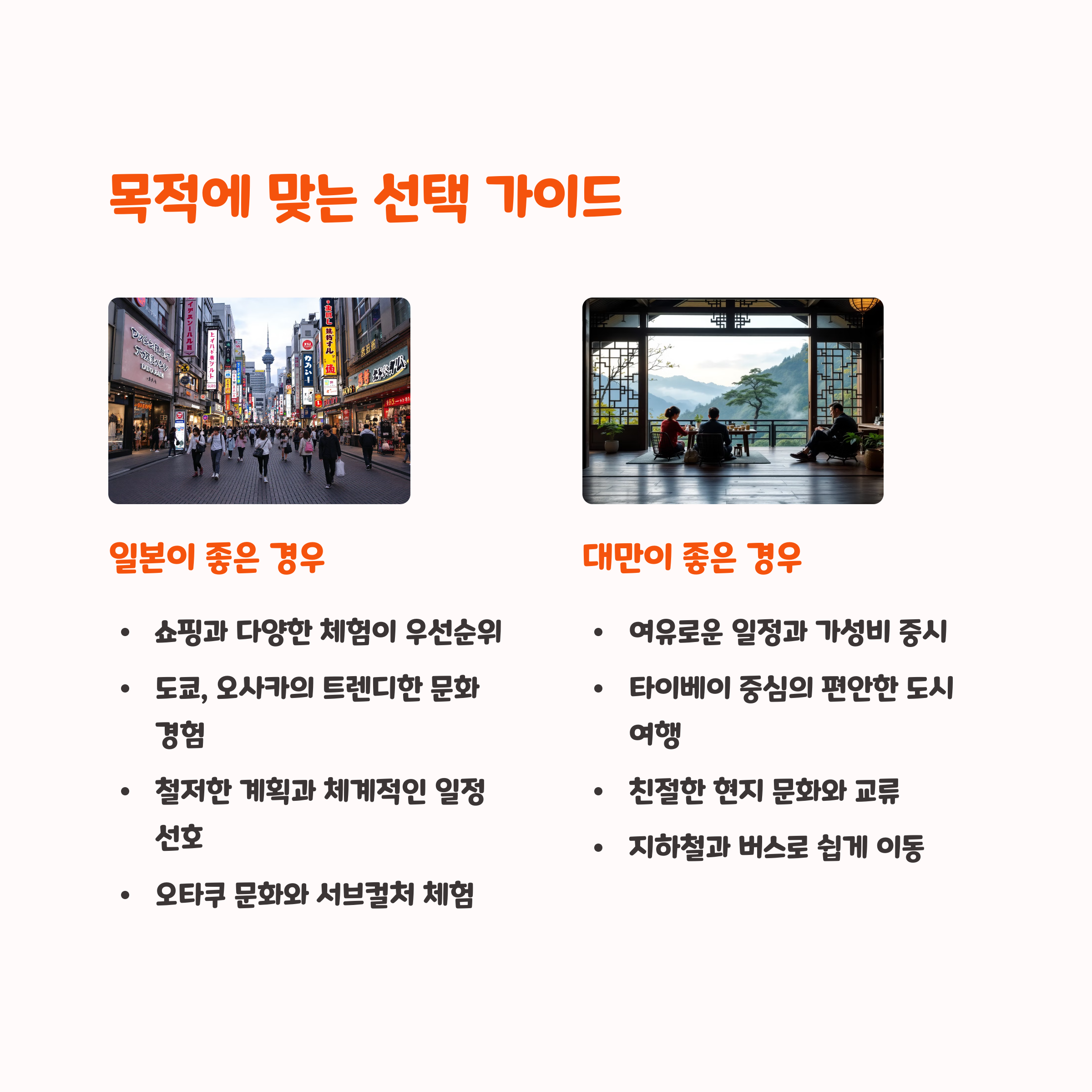 그렇다면 일본과 대만 중 어떤 곳이 더 나을까요? 가장 먼저 고려할 요소는 여행 목적입니다. 쇼핑과 문화체험, 온천 등을 좋아한다면 일본이 더 적합할 수 있습니다. 반면, 음식 위주 여행과 여유로운 분위기를 선호한다면 대만이 좋은 선택이 될 것입니다.