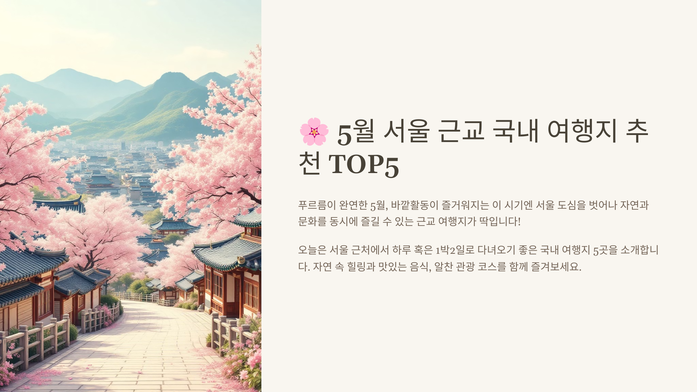 푸르름이 완연한 5월, 바깥활동이 즐거워지는 이 시기엔 서울 도심을 벗어나 자연과 문화를 동시에 즐길 수 있는 근교 여행지가 딱입니다! 오늘은 서울 근처에서 하루 혹은 1박2일로 다녀오기 좋은 국내 여행지 5곳을 소개합니다. 자연 속 힐링과 맛있는 음식, 알찬 관광 코스를 함께 즐겨보세요.