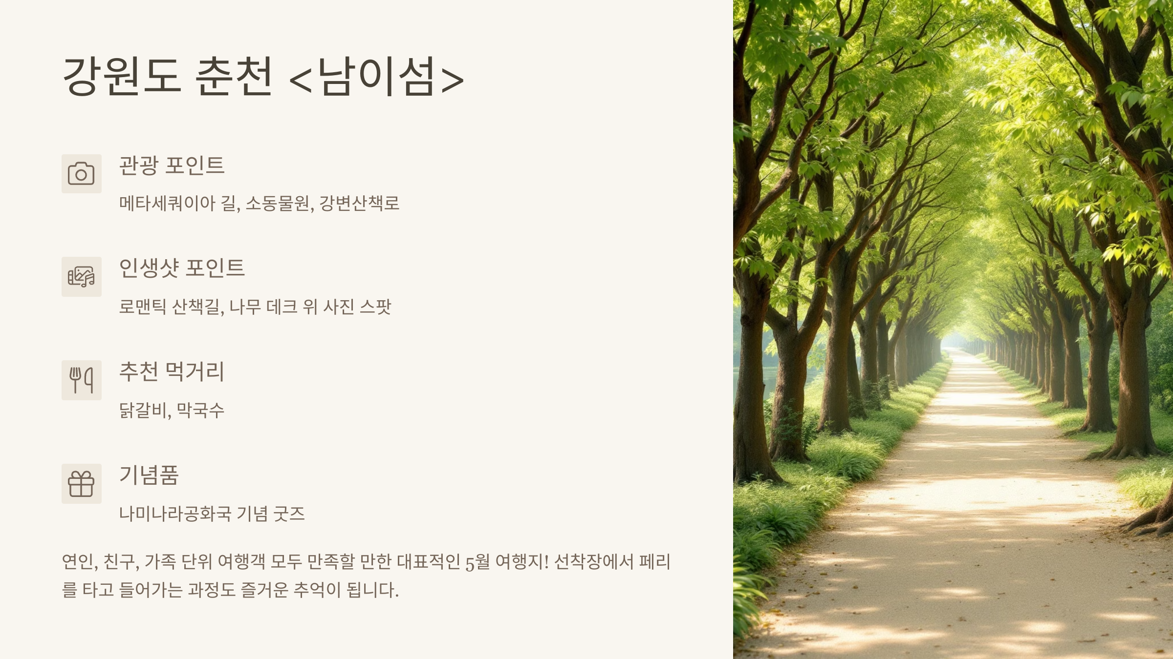 - 📌 관광 포인트: 메타세쿼이아 길, 소동물원, 강변산책로