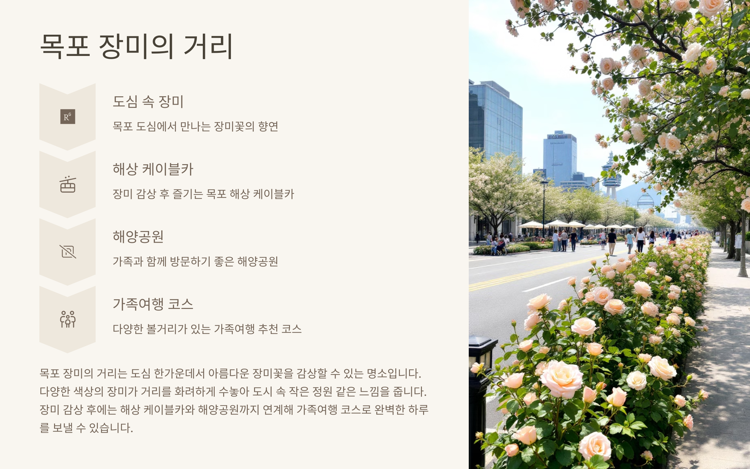 목포 도심에서 만나는 장미꽃의 향연! 해상 케이블카와 해양공원까지 연계해 가족여행 코스로 추천.