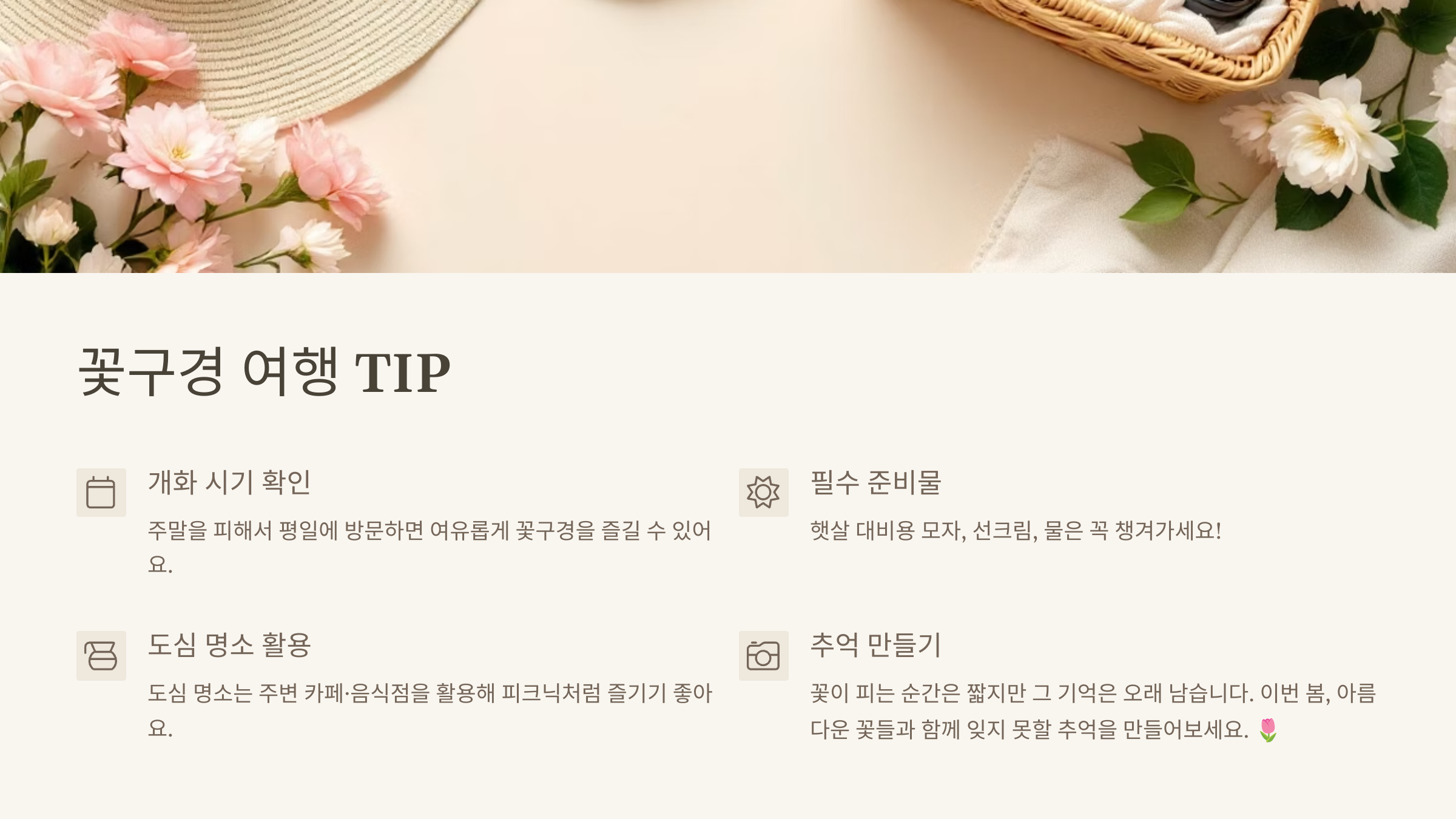 - 개화 시기 확인 후 주말 피해서 평일 방문하면 여유롭게 즐길 수 있어요.