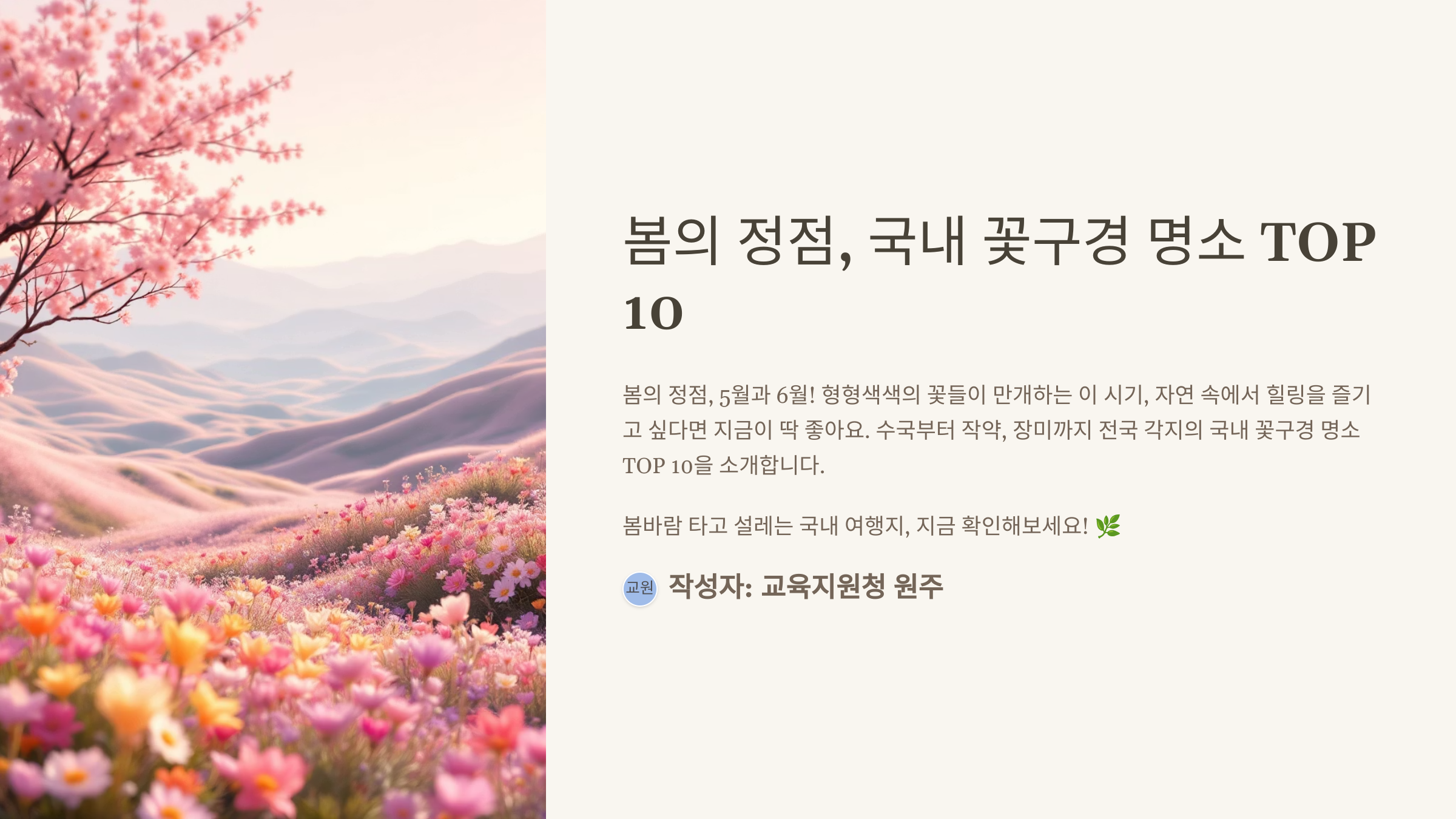 봄의 정점, 5월과 6월! 형형색색의 꽃들이 만개하는 이 시기, 자연 속에서 힐링을 즐기고 싶다면 지금이 딱 좋아요. 수국부터 작약, 장미까지 전국 각지의 국내 꽃구경 명소 TOP 10을 소개합니다. 봄바람 타고 설레는 국내 여행지, 지금 확인해보세요! 🌿